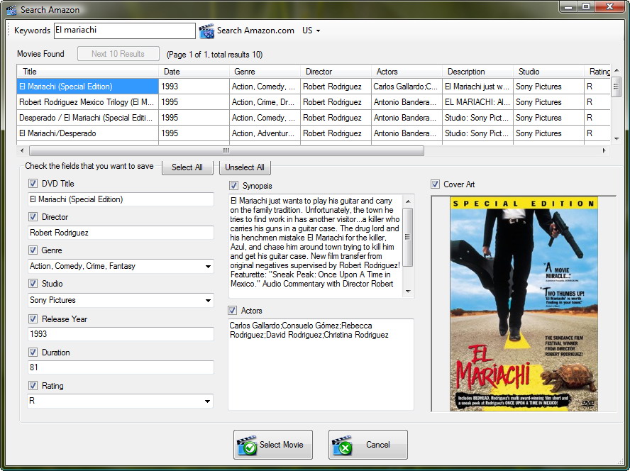 Egyelőre a mozik címén kívül minden további rubrika üres, és persze nincs DVD borító sem. Jelöljük ki az első filmet, és kattintsunk az Edit DVD Details gombra. A felugró ablakban a részletes információkat, helyesebben azok helyét találjuk. A menüsorban lévő Search Amazon.com illetve Search IMDB.com gombokkal (feltéve, hogy van internetkapcsolat) a film címe alapján lekérhetjük, majd importálhatjuk a film adatait illetve a DVD borítóját. A tapasztalatok azt mutatják, hogy az IMDB adatai jobbak (ezen nincs is mit csodálkozni), viszont az Amazon weboldalán jobb felbontású DVD borítókat találunk, ezért érdemes inkább mégis azt használni.