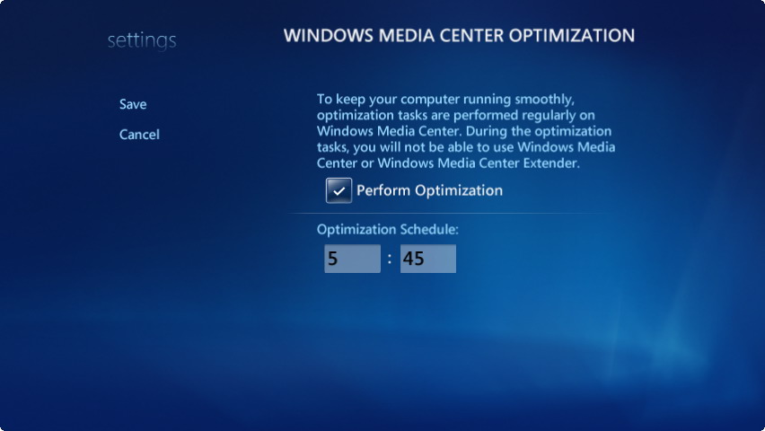 A Settings > General > Optimization útvonalon engedélyezzük az optimalizációt. Olyan időpontot állítsunk be, amikor a gép be van kapcsolva, de a Media Centert nem használjuk. Az optimalizáció során a Media Center legyártja a hiányzó előnézeti ikonokat, (a zenékhez) letölti az internetről a plusz infókat, stb, így amikor filmet nézünk, gyorsabb működésre számíthatunk.