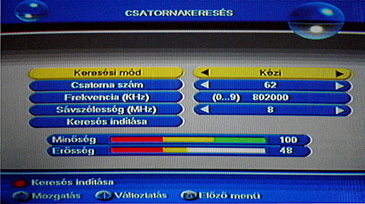Az első bekapcsoláskor azonnal a csatornakeresés menü töltődik be. Alul a jelerősséget és a jelminőséget egy grafikus ábra illetve 100-as skála jelzi. A kettő közül a jelminőség a fontosabb, a jelerősség akár 30-as szint alatt is megfelelő lehet. Automatikus és kézi hangolás között választhatunk. Kézi hangolás esetén Budapesten az 55-ös és 62-es csatornát kell kijelölni, és ezeken kell lefuttatni a keresést (egymás után). Az automatikus keresés két percet, a kézi hangolás néhány másodpercet vesz igénybe, ezután használatba is vehetjük az STB-t.