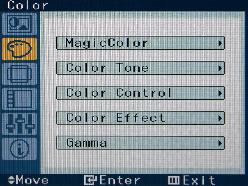 A menü kezelésére szolgáló gombokkal kicsit bajban vagyunk. Egyrészt az érintőgombokat nem szeretjük, bár ez esetben az érzékenységgel nem volt probléma; másrészt viszont, és inkább ez a gond, a gombok feletti feliratok csak közelről olvashatók. A feliratok annyira beleolvadnak a kávába, hogy egyébként nem látszanak. Ha kedvünk tartja, a gombok helyett elvileg használhatjuk a MagicTune szoftvert is a beállításokhoz, a gyakorlatban viszont ez kevésbé kényelmes megoldás, főleg akkor, ha egy teljes képernyős játék, vagy filmnézés közben szeretnénk a fényerőn/kontraszton változtatni.