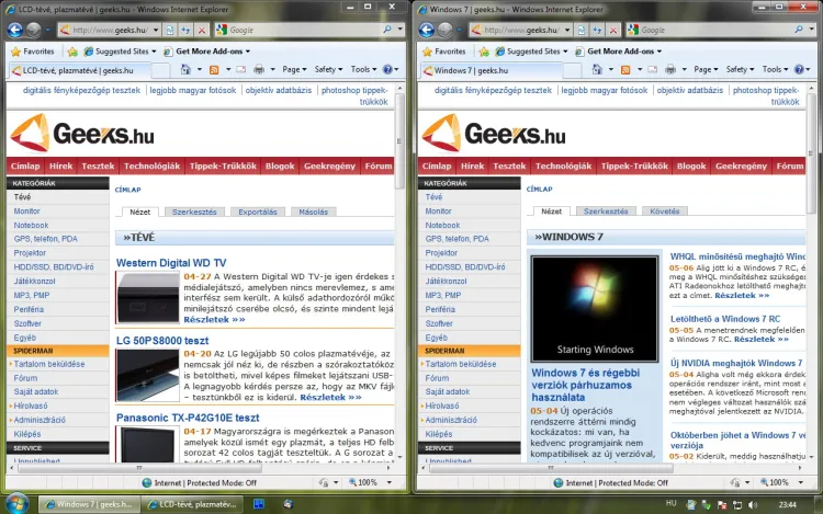 Az Aero Snap az ablakok célzott átméretezését gyorsítja meg; lehetőséget ad az ablakok teljes képernyős méretűvé alakítására (és az eredeti állapot visszaállítására), a programok ablakának tálcára küldésére, valamint arra, hogy az ablakot pontosan a kijelző bal vagy jobb felére méretezzük. Ez utóbbi elsősorban akkor hasznos, ha például két weboldal vagy két dokumentum tartalmát szeretnénk összehasonlítani. Ez egyébként a Windows XP-ben és Vistában már meglévő Egymás mellett és Egymás alatt funkciókat váltja fel, amelyek a Windows 7-ből hiányoznak. (Win XP/Vista alatt a CTRL segítségével jelöljünk ki két ablakot a tálcán, majd jobb gomb valamelyiken.)