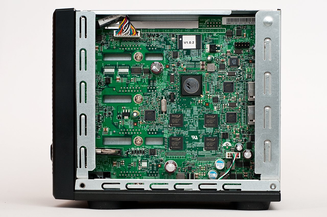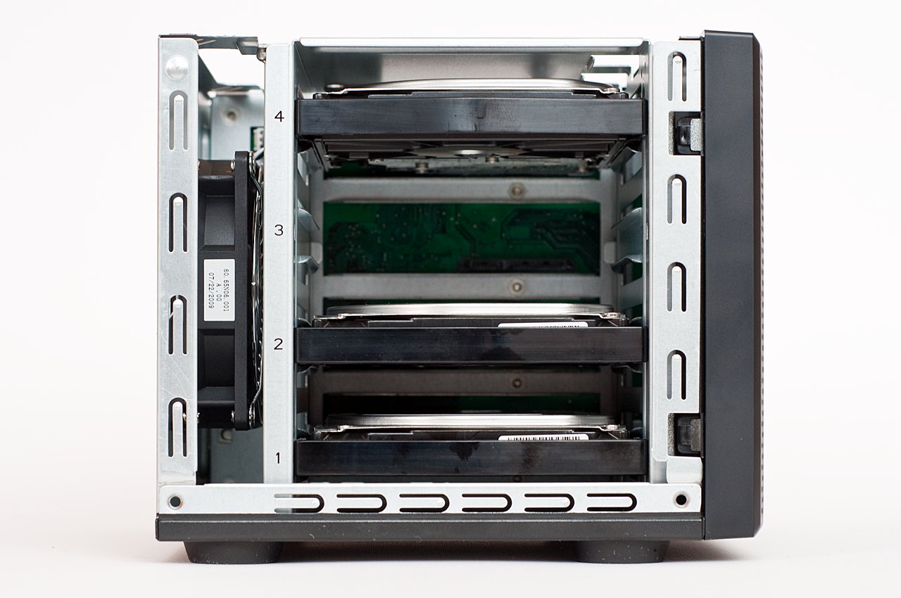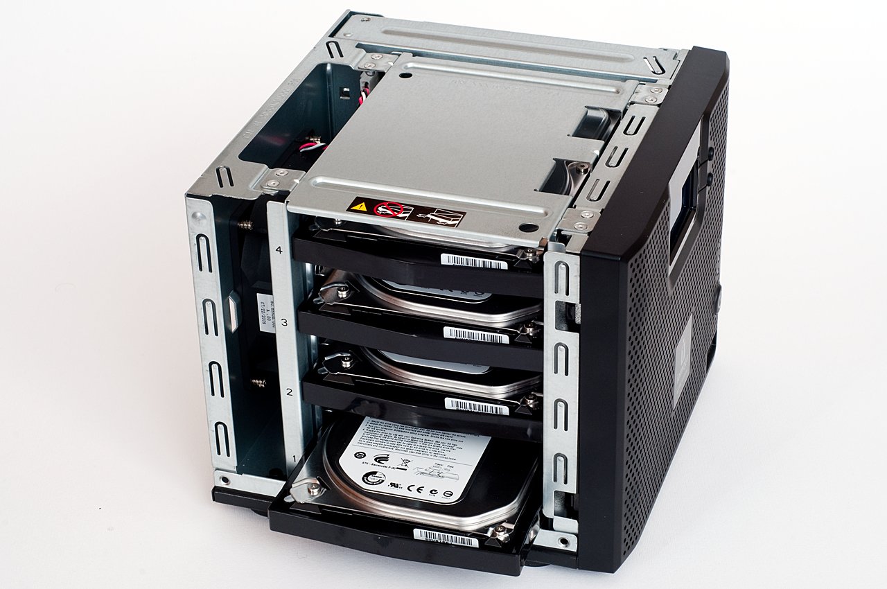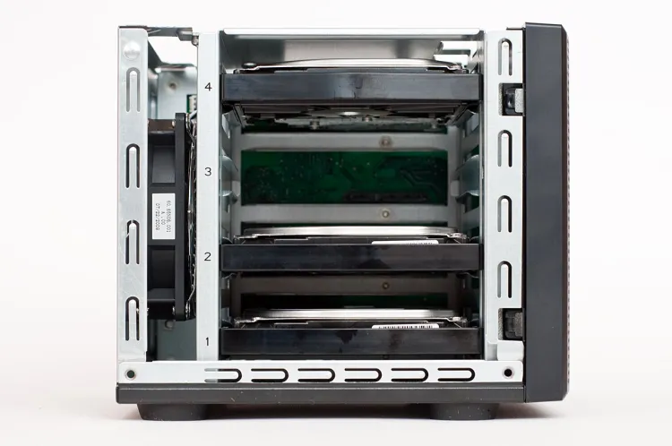 A készülék szétszereléséhez a hátoldalon található két csavart kell kitekerni (ez kézzel is megy). Ezután a merevlemezeket a bal oldalról húzhatjuk ki mindenféle külön csavarozás vagy más, szerszámot igénylő mechanizmus oldása nélkül. A vinyókat egyébként a rájuk szerelt műanyag keret tartja a helyükön. Az elektronika jobb oldal kapott helyet, a hűtésről pedig a hátoldalon elhelyezett ventilátor gondoskodik, átlagos használat során meglehetősen halkan.