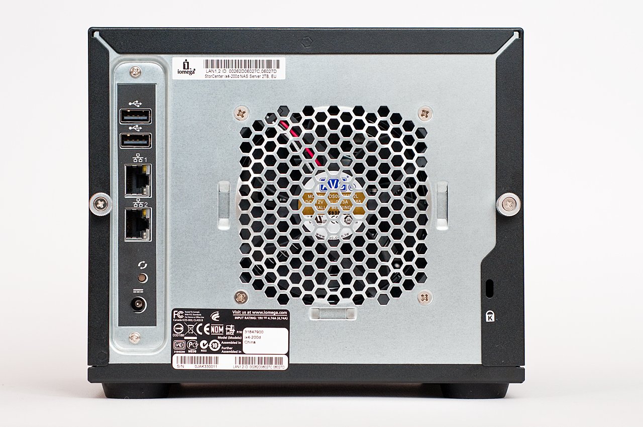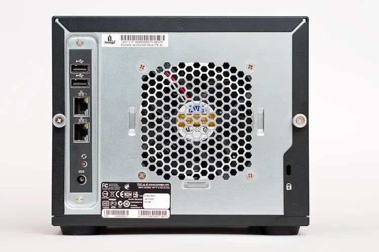 A hátoldalon többféle csatlakozó található – itt van például két USB port, ami az előlapival együtt lehetővé teszi több printer, USB kulcs vagy éppen külső merevlemez csatlakoztatását. Ezeket megoszthatjuk a hálózaton, illetve háttértárak esetében használhatjuk őket adatmentésre is, illetve fordítva; például digitális fényképezőgépekről is lementhetjük a képeket a NAS egy megadott könyvtárába.