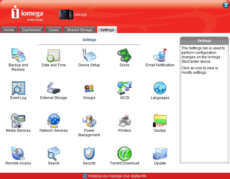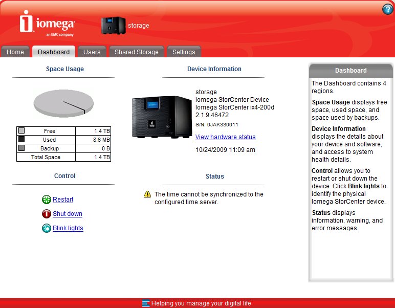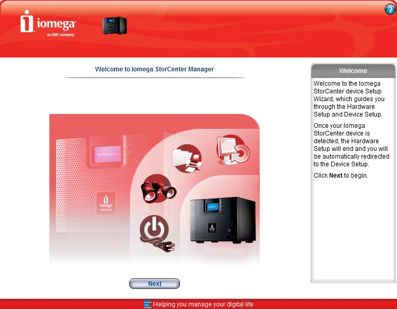 Mivel az Iomega az ix4-200d-t már merevlemezekkel együtt szállítja, összeszerelésre nincs szükség, csak csatlakoztatnunk kell a NAS-t a hálózathoz (a készülék dobozában hálózati kábelt is találunk erre a célra), bedugnunk a tápegységet és megnyomni a bekapcsoló gombot. Bár kapunk mellé telepítő CD-t is, erre igazából csak akkor lesz szükségünk, ha telepíteni akarjuk a biztonsági mentésekre szolgáló EMC Retrospect Express HD-t. Illetve még akkor, ha a hálózaton nincs DHCP szerver, mert ebben az esetben az Iomega Storage Manager segít megtalálni a NAS-t (aktív DHCP-vel az IP cím leolvasható a kijelzőről, valamint a NAS megjelenik a Windows Hálózati helyek mappájában is). Belépve a kezelői felületre, annak „szűz” állapotában először a Configuration Wizard fogad majd minket, amivel az alapbeállításokat kell elvégeznünk. Az Iomega két megosztást alapból létrehozott, amelyek ráadásul alapértelmezés szerint teljesen publikusak is (azaz a hálózatról szabadon elérhetők és módosíthatók). Ez azt jelenti, hogy ha olyan környezetben akarjuk használni az ix4-200d-t, ahol nincs szükség egyedileg, felhasználónként szabályozni a hozzáféréseket, és nem akarunk saját könyvtárakat létrehozni, a NAS gyakorlatilag 5 perccel a bekapcsolása után már használható is biztonságos háttértárként.