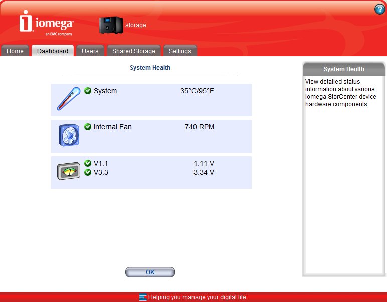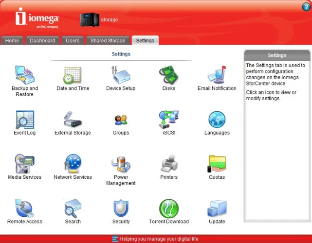 Az igényes kinézetű felhasználói felület öt fő részre oszlik – a Home fül alatt a legfontosabb funkciókat érhetjük el, például innen kezelhetjük a beállított torrenteket és itt oszthatjuk meg a NAS-hoz csatlakoztatott nyomtatókat is. A Dashboardnál a gép állapotát látjuk (és itt lehet a kijelző fényerejét is állítani), a Users alatt a felhasználókat, a Shared Storage-nál pedig a megosztásokat kezelhetjük.