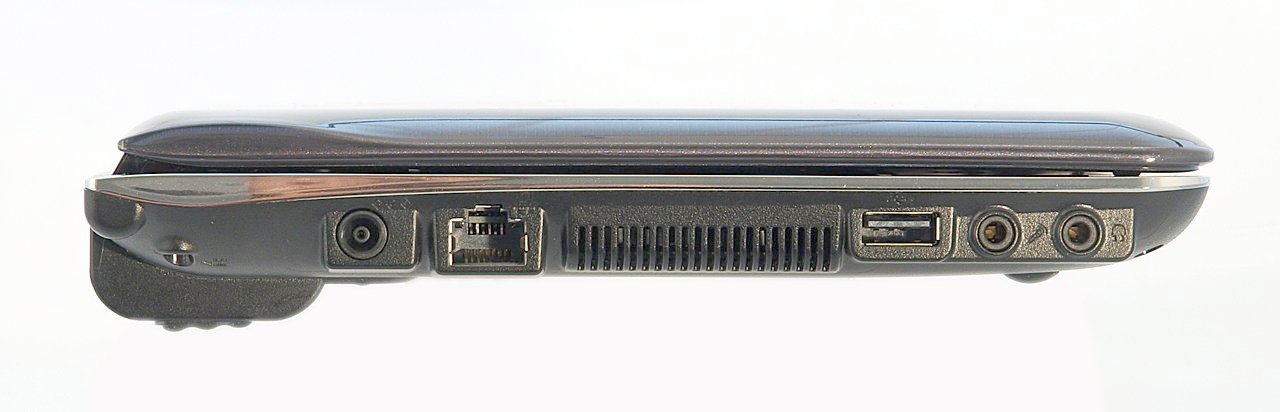 A bal oldalon először a két hangcsatlakozót találjuk, majd egy USB port következik. Ezután jön a hűtés kivezetőnyílása, az Ethernet port (a hálózati kártya 10/100-as) és a tápcsatlakozó. A jobb oldalra szintén előröl haladva két USB port, a D-Sub kimenet, majd egészen hátul a Kensington zár nyílása kapott helyet. A kártyaolvasó (ami SD/SDHC/MMC kompatibilis) és a bekapcsoló gomb a gép elején található. Mindezeket összeadva láthatjuk, hogy 3 USB port, hálózati, audio és analóg videokimenet áll rendelkezésre – azaz pontosan ugyanazok, amit ennél a kategóriánál már megszokhattunk.