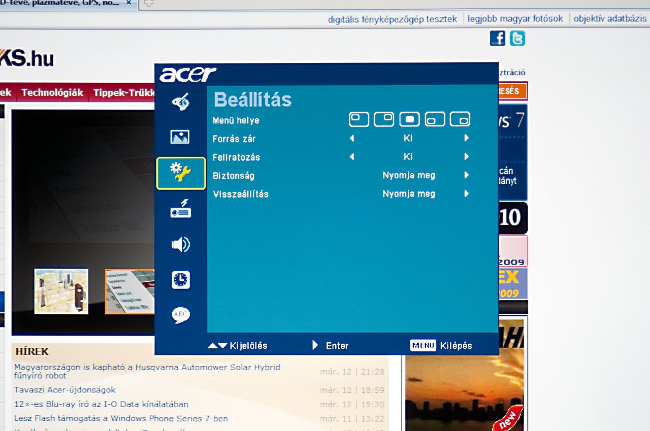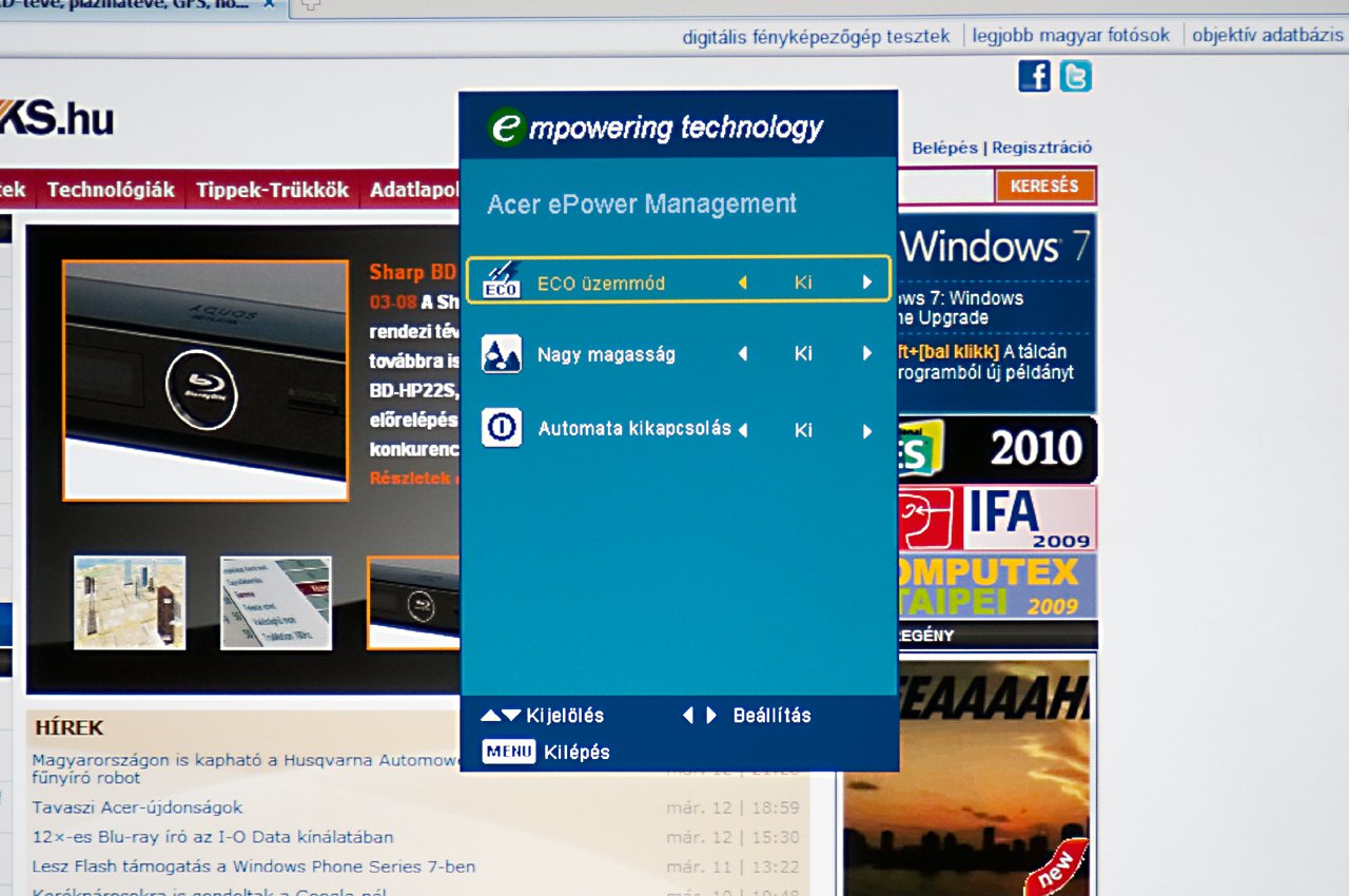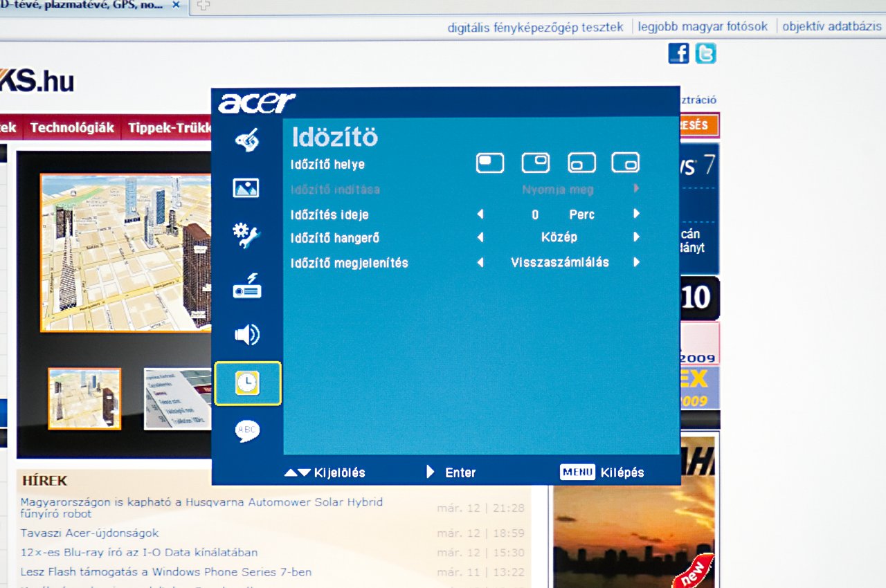 A rendelkezésünkre álló beállítások száma természetesen függ attól, hogy milyen bemenetet használunk, de általánosságban csak közepes szintűek. Kifejezetten jópofa viszont a Szín menüben a Fal színe opció: ezzel színes fal esetén is többé-kevésbé színhelyes képet kapunk. Az Acertől megszokott módon van Empowering menü is – ezt az E betűvel jelölt zöld gombbal hívhatjuk elő, és tetszés szerint a hétféle üzemmódot, a képernyőn megjelenő visszaszámlálót vagy az ePower Management nevű, az ECO üzemmódot, a nagy magasságban szükséges erősebb hűtést és az automata kikapcsolást engedélyező menüt érhetjük el vele.