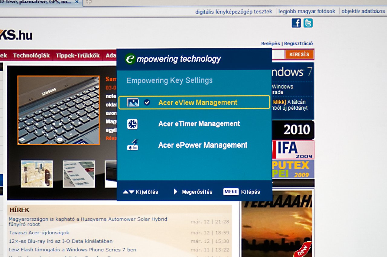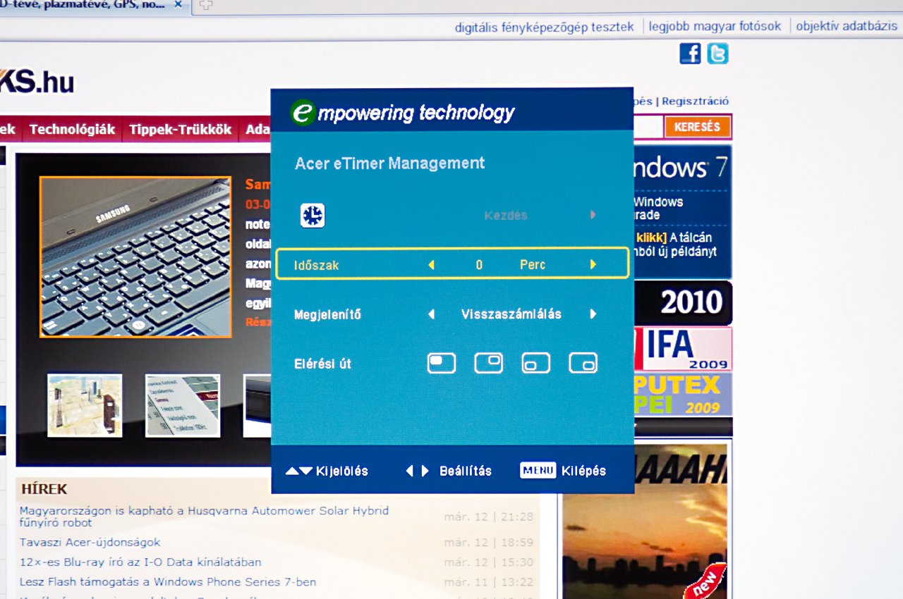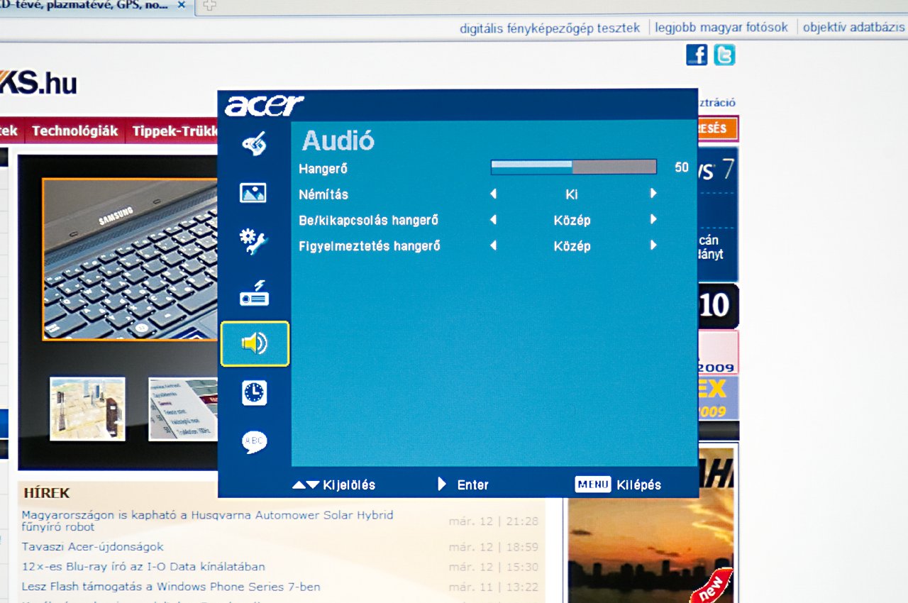 A rendelkezésünkre álló beállítások száma természetesen függ attól, hogy milyen bemenetet használunk, de általánosságban csak közepes szintűek. Kifejezetten jópofa viszont a Szín menüben a Fal színe opció: ezzel színes fal esetén is többé-kevésbé színhelyes képet kapunk. Az Acertől megszokott módon van Empowering menü is – ezt az E betűvel jelölt zöld gombbal hívhatjuk elő, és tetszés szerint a hétféle üzemmódot, a képernyőn megjelenő visszaszámlálót vagy az ePower Management nevű, az ECO üzemmódot, a nagy magasságban szükséges erősebb hűtést és az automata kikapcsolást engedélyező menüt érhetjük el vele.