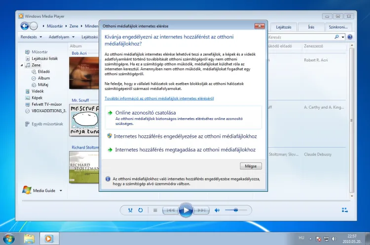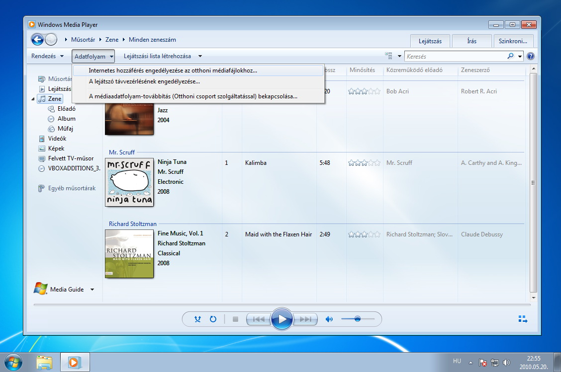 Először is engedélyeznünk kell a streaminget azon a számítógépen, amelyik a multimédiás fájlokat tartalmazza. A magyar Windows 7-ben Adatfolyamra fordították ezt az opciót, talán kissé szerencsétlenül. Válasszuk ki tehát ezt a lehetőséget a Windows Media Player felső menüjéből, majd a lenyíló menüben kattintsunk az Internetes hozzáférés engedélyezése az otthoni médiafájlokhoz… opciót.