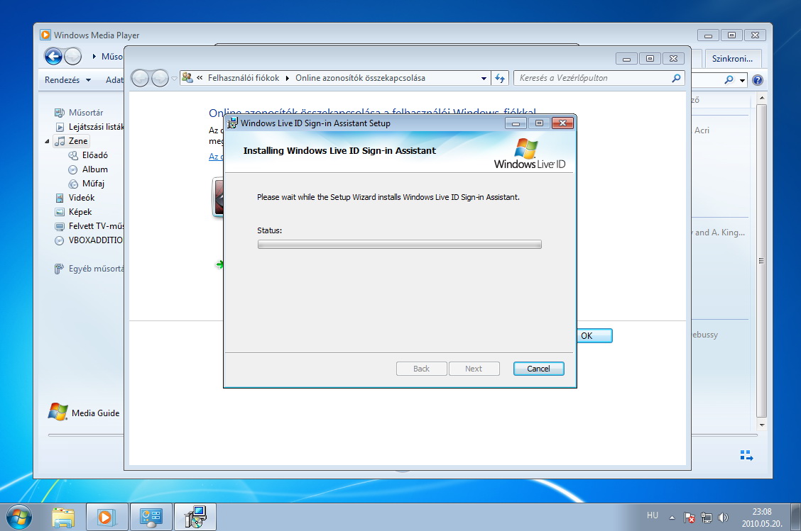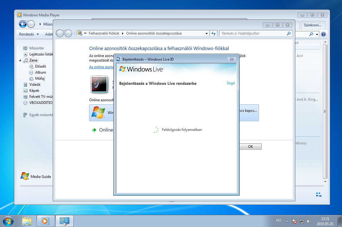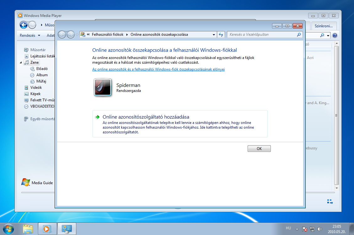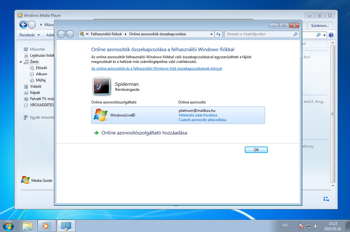 Amikor készen vagyunk, megváltozik a korábbi felület, és az Online azonosító hozzáadása felett megjelenik a WindowsLiveID opció. Kattintsunk az Online azonosító csatolása feliratra, majd a felugró ablakban írjuk be Live ID felhasználói nevünket és jelszavunkat.