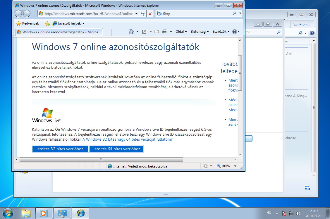 Először azonban csatolnunk kell az azonosítót; kattintsunk az első menüpontra. Az újabb felugró ablak a felhasználói fiókunk beállításaihoz visz, itt az Online azonosító hozzáadása opcióra kell kattintanunk. A Windows 7 online azonosítószolgáltatók weblapon válasszuk ki a Windows verziónkhoz kapcsolódó modult (32 vagy 64 bites), és telepítsük. A néhány Mbájtos csomag letöltése és telepítése mindössze egy percig tart. (Elvileg nemcsak a Microsoft saját rendszere lehet azonosító, de egyelőre más alternatívát nem választhatunk. Az online azonosítóra egyébként értelemszerűen azért van szükség, mert így tudjuk azt biztosítani, hogy a fájlokhoz más ne, csak mi férjünk hozzá.)