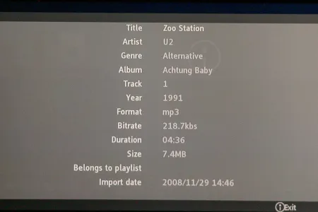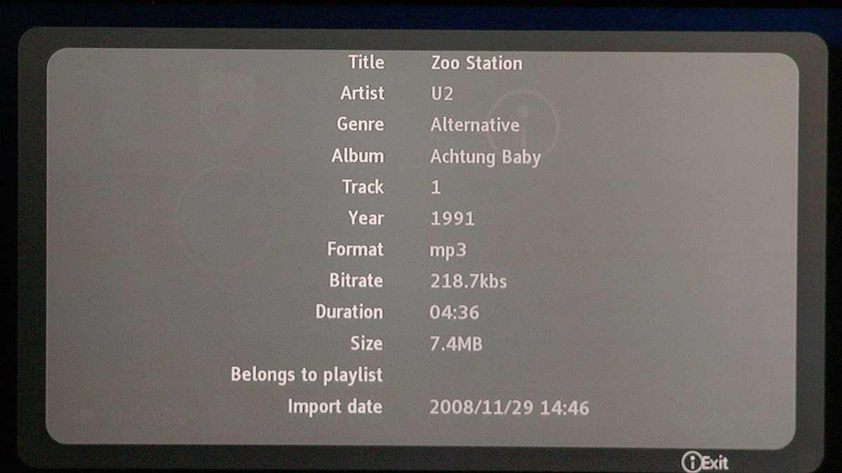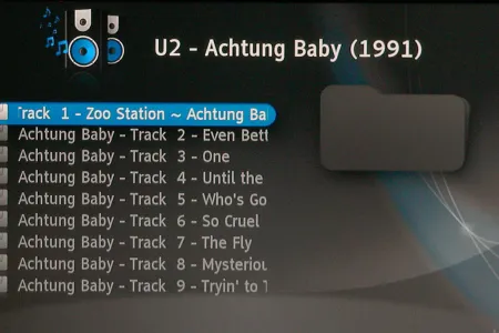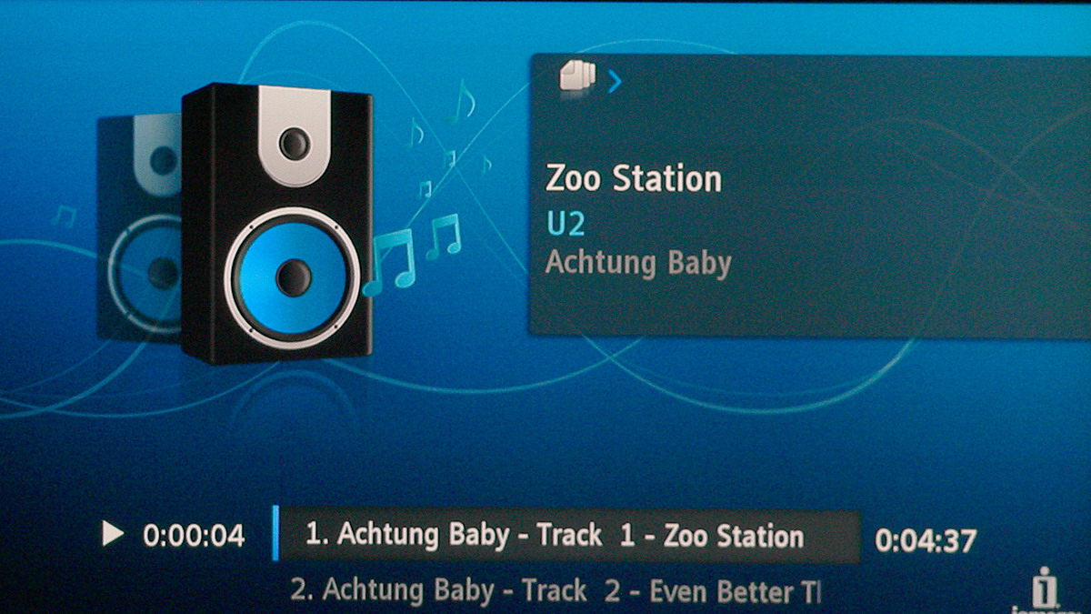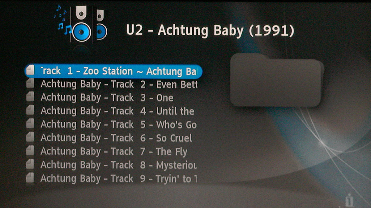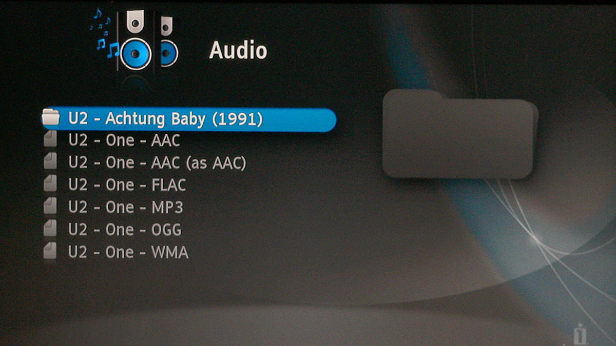 Az audio fájlok közül a lejátszó minden tökéletesen kezelt, a szokásos MP3, OGG, AAC, FLAC és WMV ötössel próbálkoztunk. A kezelőfelület itt sem ad sok lehetőséget, a következő opciók közül választhatunk: ismétlés, véletlenszerű lejátszás, illetve kérhetünk lista nézetet és szám nézetet.