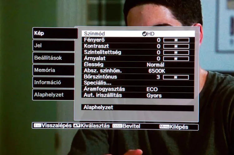 A projektor specifikációiban olvasható 200 000:1-hez kontraszt (ami a tévékhez hasonlóan dinamikus kontrasztot jelent, a projektor ugyanis jelenetről jelenetre állít a fényerőn) előállításában segédkező aktív íriszt két fokozatban, illetve teljesen ki is kapcsolhatjuk. Van kontraszterősítés, külön fokozatok a bőrszín optimálissá tételéhez, képkockainterpoláció, 4-4/2-3 Pull-down, Overscan és többféle zajszűrés is – amíg mindent végigpróbálgatunk, könnyen eltelik 1-2 nap.