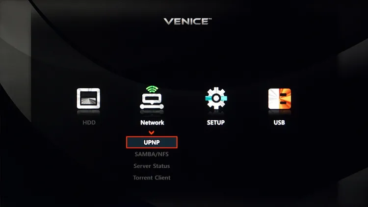 A hálózati beállításoknál az UPnP, Samba és NFS kapcsolatokat állíthatjuk be – utóbbi kettőre akkor lehet szükségünk, ha hálózati kapcsolaton keresztül az MKV fájlokat is el szeretnénk érni, ezek ugyanis UPnP-n keresztül általában nem látszódnak. A Samba szervereket a Venice automatikusan megtalálja, az NFS hálózati helyeket viszont kézzel kell beállítanunk. (Windowshoz kapunk NFS fájlszerver programot a V13 HD mellé, amit a gyártó honlapjáról tölthetünk le.)