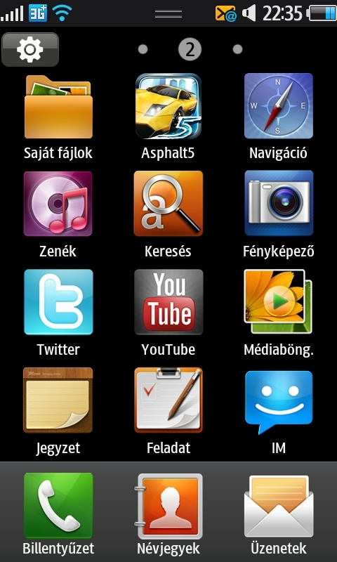 A kijelző legalsó sorában három ikon fogad bennünket, amelyekkel a legfontosabb funkciókat érhetjük el – nevezetesen a telefont, a névjegyeket és az üzeneteket. Ez a sáv szinte mindig velünk van, még az főmenüben is, ami nagyon hasznos, hiszen mindig hozzáférünk az alapdolgokhoz. Ugyanilyen állandó segítséget nyújt a felülről lehúzható státuszsor, amin a fontosabb információk mellett a különféle funkciókat (Bluetooth, WLAN, stb.) kapcsolhatjuk ki- és be, megnézhetjük az értesítéseket, illetve ha zenét hallgatunk, akkor a zenelejátszó fontosabb funkcióit is elérjük.