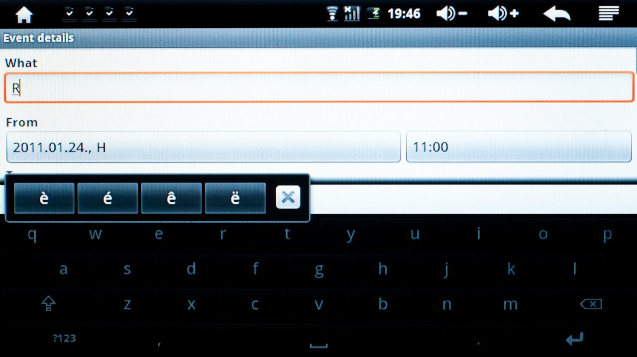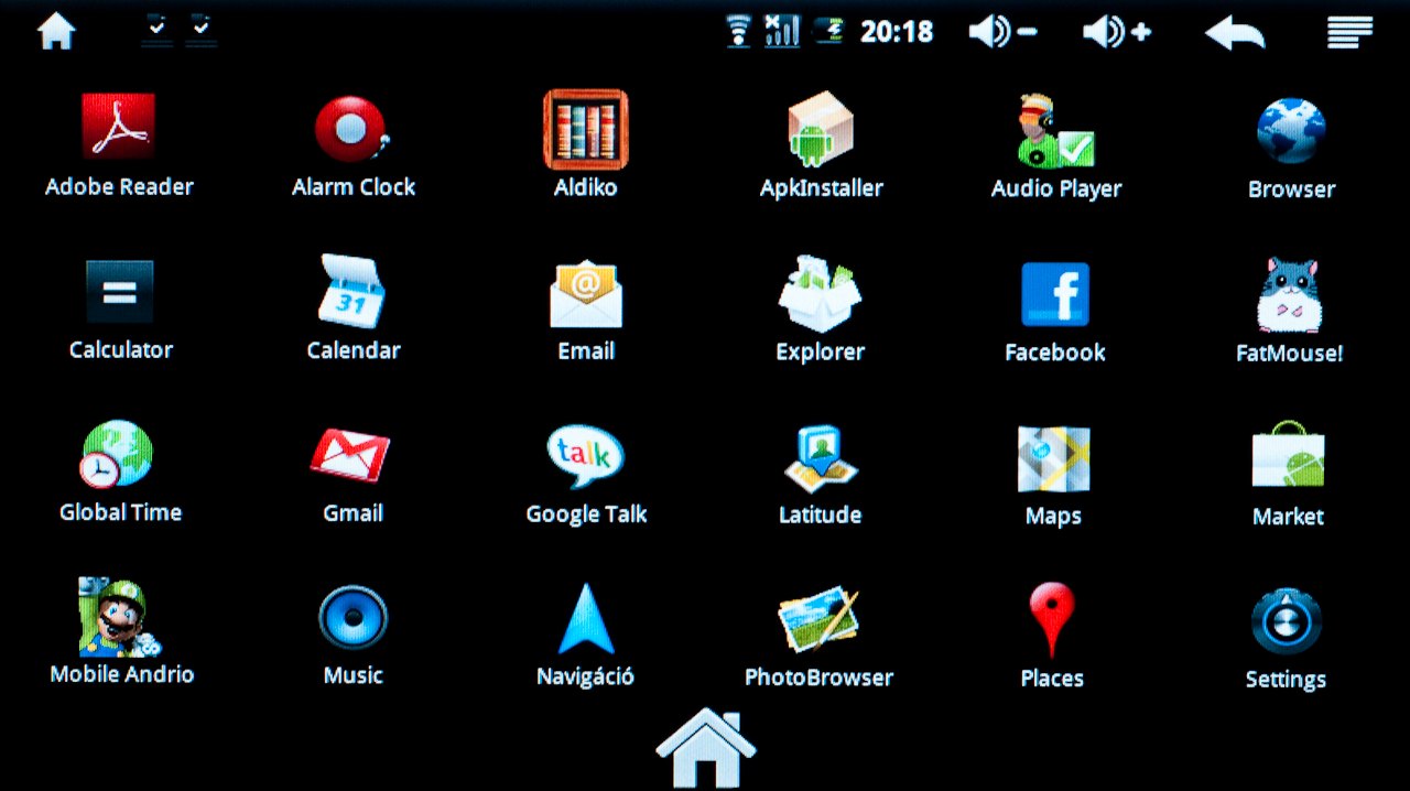 Valamennyi képernyő kötelező eleme a jobb oldalon középen látható 4×4-es, négyzetekből álló ikon, aminek megnyomásával a főmenübe jutunk. Ez is az Androidtól megszokott kinézetű és felépítésű – az itt lent középen található ház ikonnal pedig a kezdőképernyőre léphetünk vissza. Szövegbevitelre az Androidon megszokott alap billentyűzet használható, természetesen ékezetekkel együtt.