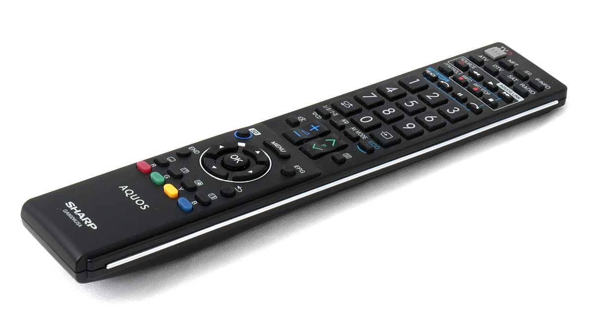 A távirányító fogása kényelmes, de a gombok többsége elég pici rajta ahhoz, hogy a sötétben gyorsan megtaláljuk őket. A használatot nehezíti picit az is, hogy a gombok emellett még puhák is. A Sharp korábbi távirányítóin megtalálható extra gombok mellé (színprofil, képarány, bemenet, eco mód, epg, teletext, timeshift, AQUOS link) felkerült a 3D gomb is, amivel a 3D beállításokat módosíthatjuk illetve a 2D-3D koverziót aktiválhatjuk.