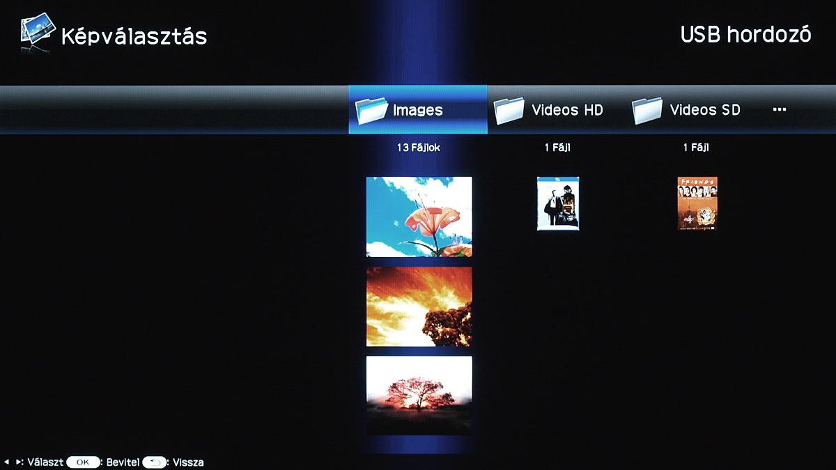 De kezdjük a médialejátszóval, amely a Sharpnál szintén első generációs. Az LE8-as és LE9-es sorozatban ugyanaz a szoftver dolgozik. Az USB csatlakozóra kötött meghajtót a bemenetválasztó segítségével választhatjuk ki, külön médialejátszó gombot nem ad a Sharp a távirányítón. Ezt részben pótolja, hogy az USB stick csatlakoztatásakor automatikusan elindul a médialejátszó GUI-ja. A főképernyő a három főkategória, a videók, zenék és képek elérésére szolgáló ikonokat tartalmazza.