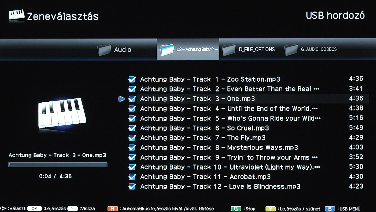 A zenelejátszó szintén fapados. Csak az MP3 fájlokat látja, a beállítások pedig kimerülnek abban, hogy megadhatjuk, hogy automatikus lejátszás esetén mely fájlok kerüljenek be a lejátszási listába. Bár a kezelőfelület áttekinthető, a szoftver még az ID3 mezők tartalmát sem olvassa ki, így informatívnak és látványosnak nem mondanánk.