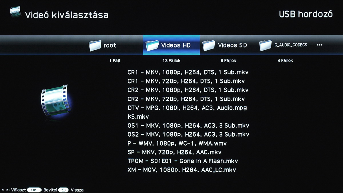 A mappakezelés kicsit szokatlan (a nem Sharp tévékhez képest), a médialejátszó ugyanis a mappákat a felső sávban mutatja, míg középen az éppen kiválasztott mappa tartalma látható, fájlnévvel (és kiterjesztéssel), előnézeti kép nélkül. Az egészben persze nem ez az érdekes, hanem az, hogy a rendszer kisimítja a mapparendszert, ha például a főkönyvtárban A és B mappa van, az A-ban pedig még egy C is, akkor a mappákat mutató sávban ezek egymás mellett látszódnak, éppen úgy, mintha egy szinten lennének. A tévé az adattároló csatlakoztatásakor egyébként az egész meghajtót végignézi, és csak azokat a mappákat mutatja meg, amelyekben legalább egy olyan fájl van, amelyet (elméletileg) le tud játszani.