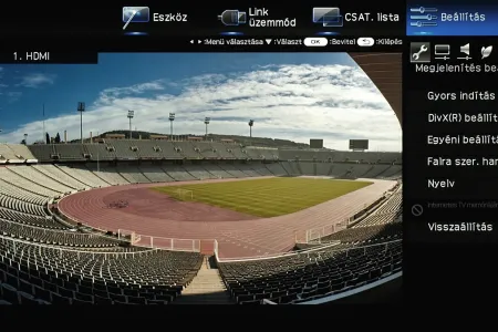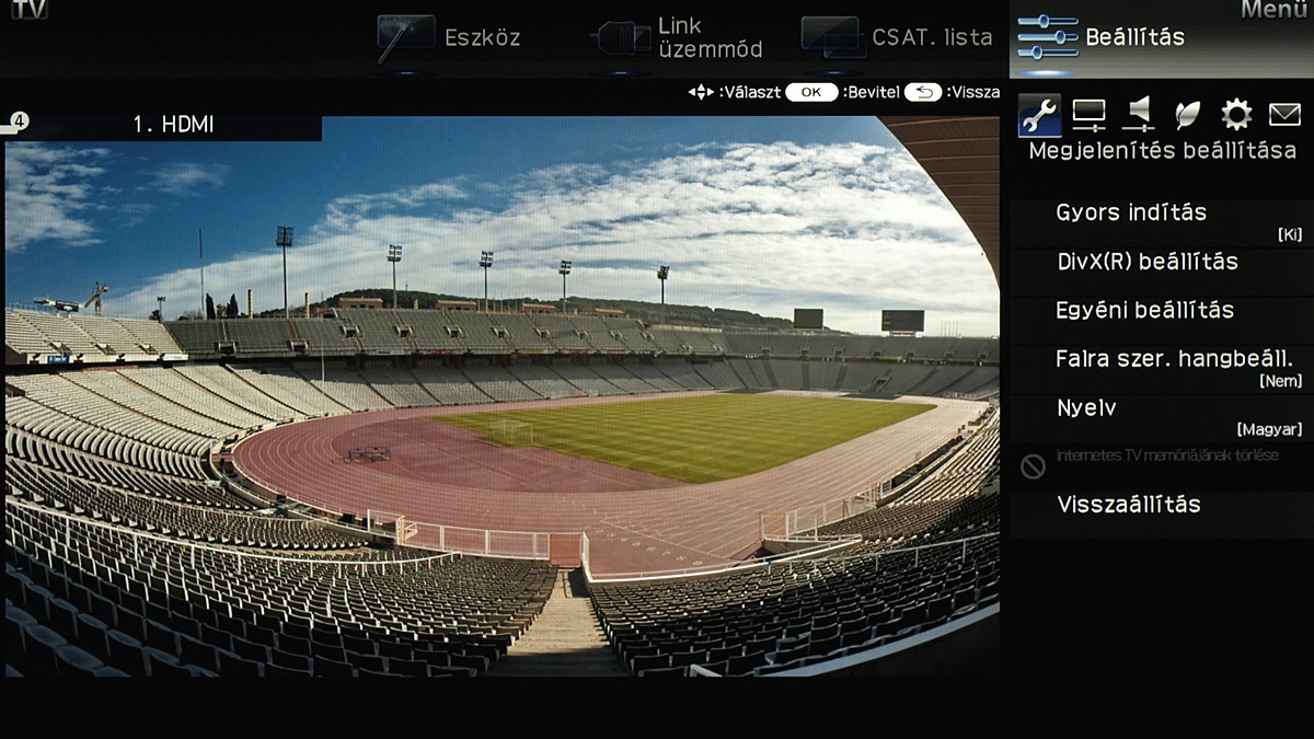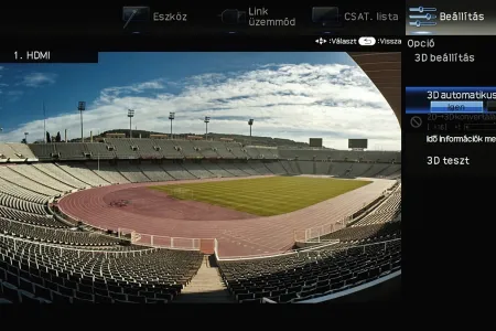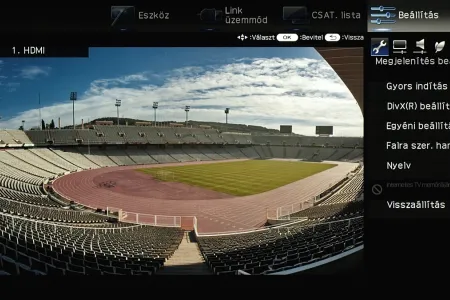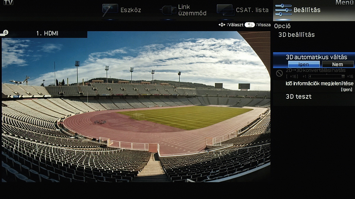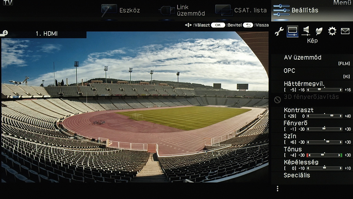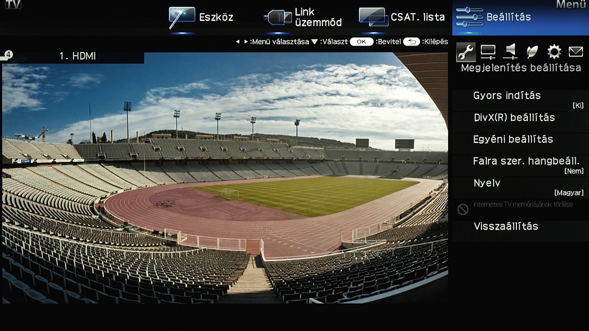 A menü csak a kijelző felső és jobb oldali részét foglalja el, ha bármit állítani szeretnénk akkor a fennmaradó, elég nagy méretű helyen a tévé képét látjuk „kicsiben”. Ez azért jó, mert így majdnem mindig azonnal látható, hogy egy adott paraméter megváltoztatása milyen eredménnyel jár. Azért csak majdnem, mert a menü szigorúan 2D-s, így a 3D-vel kapcsolatos beállítások előnézeti képéről le kell mondanunk. Az elrendezés kicsit szokatlan más tévék menüjéhez képest, de gyorsan meg lehet szokni.