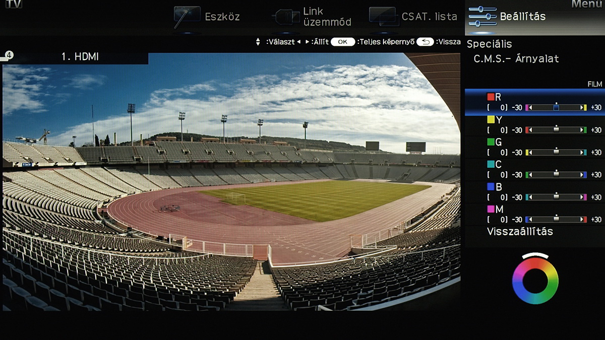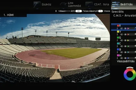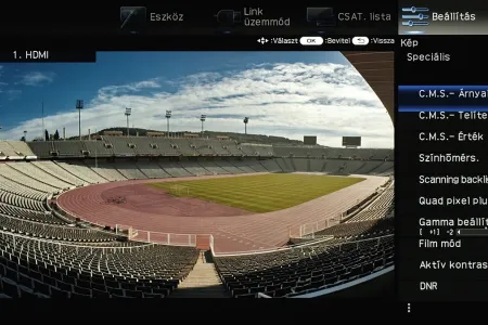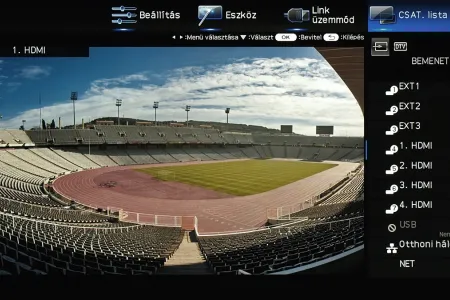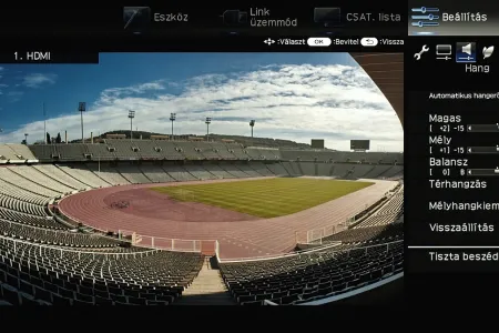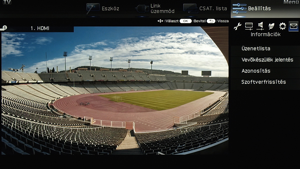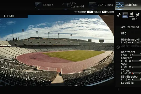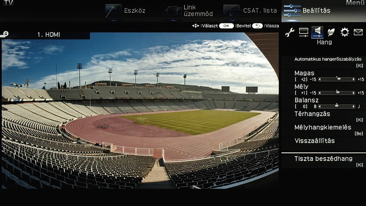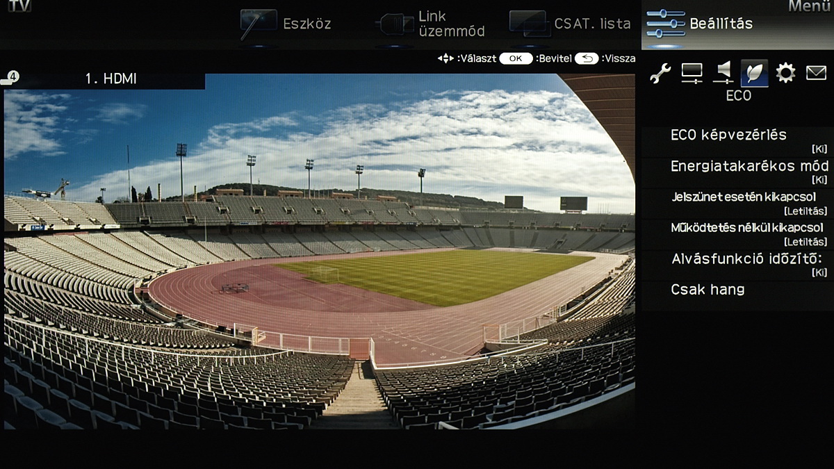 A menü csak a kijelző felső és jobb oldali részét foglalja el, ha bármit állítani szeretnénk akkor a fennmaradó, elég nagy méretű helyen a tévé képét látjuk „kicsiben”. Ez azért jó, mert így majdnem mindig azonnal látható, hogy egy adott paraméter megváltoztatása milyen eredménnyel jár. Azért csak majdnem, mert a menü szigorúan 2D-s, így a 3D-vel kapcsolatos beállítások előnézeti képéről le kell mondanunk. Az elrendezés kicsit szokatlan más tévék menüjéhez képest, de gyorsan meg lehet szokni.
