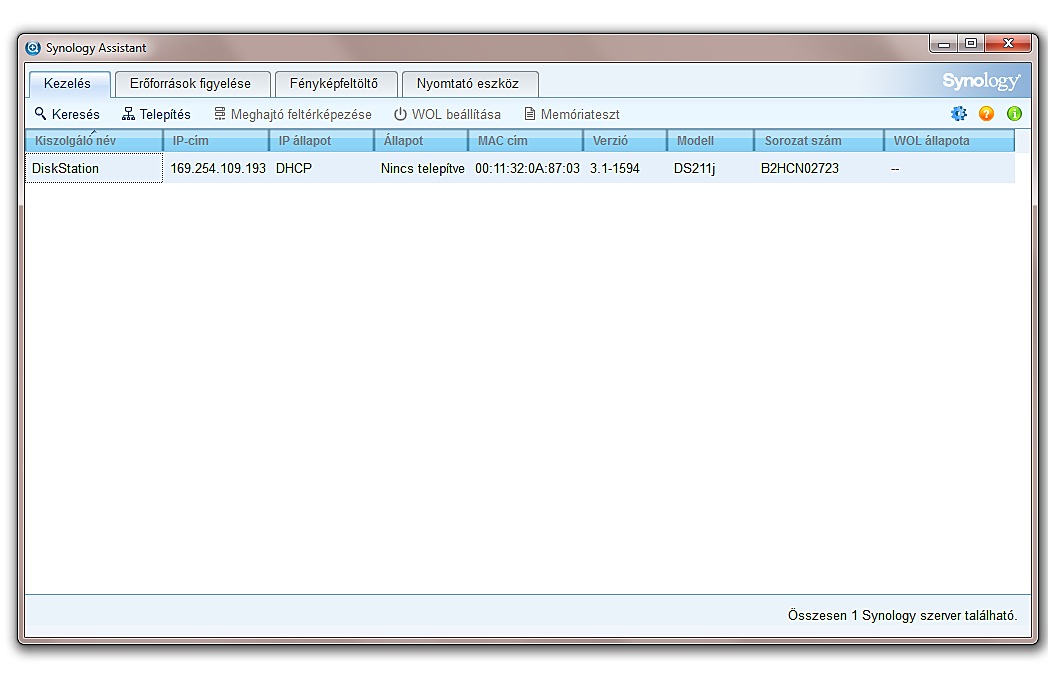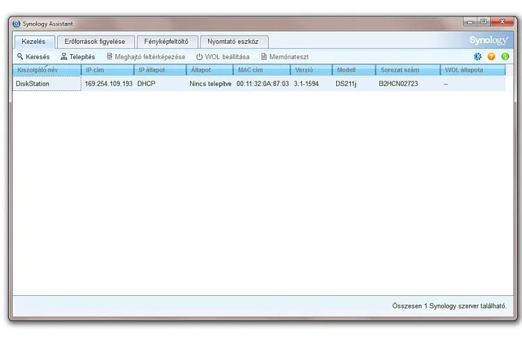 A merevlemezekkel feltöltött NAS-t ezek után csatlakoztatnunk kell a hálózathoz, majd megnyomni a Power gombot. A készülék megkereséséhez érdemes a telepítőlemezen lévő Synology Assistant programot elindítani, ami néhány pillanat alatt megtalálja nekünk a DS211j-t.
