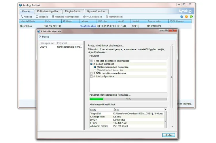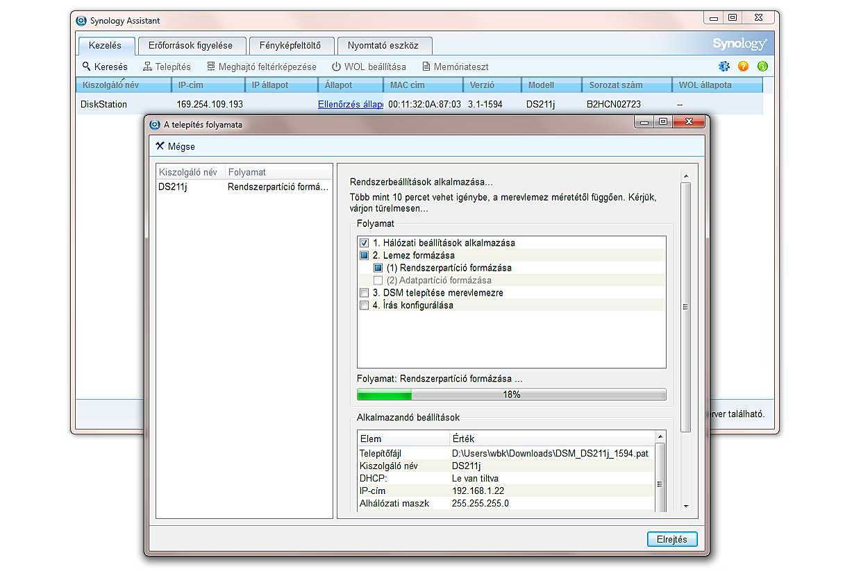 Ha ez megvan, a Telepítés gomb segítségével feltölthetjük rá a CD-n található operációs rendszert, megadhatjuk a NAS nevét, elvégezhetjük az alapvető hálózati beállításokat (IP cím, DHCP használata, pontos idő és így tovább). Magának az operációs rendszernek a telepítése viszonylag hosszú időt vehet igénybe, az Assistant körülbelül 10 percet ír az egész folyamatra, ami az újabb hardvernek köszönhetően már elég nagyvonalú becslés, a valódi idő a mi két 1 TB-os merevlemezünk esetében 6 perc volt.