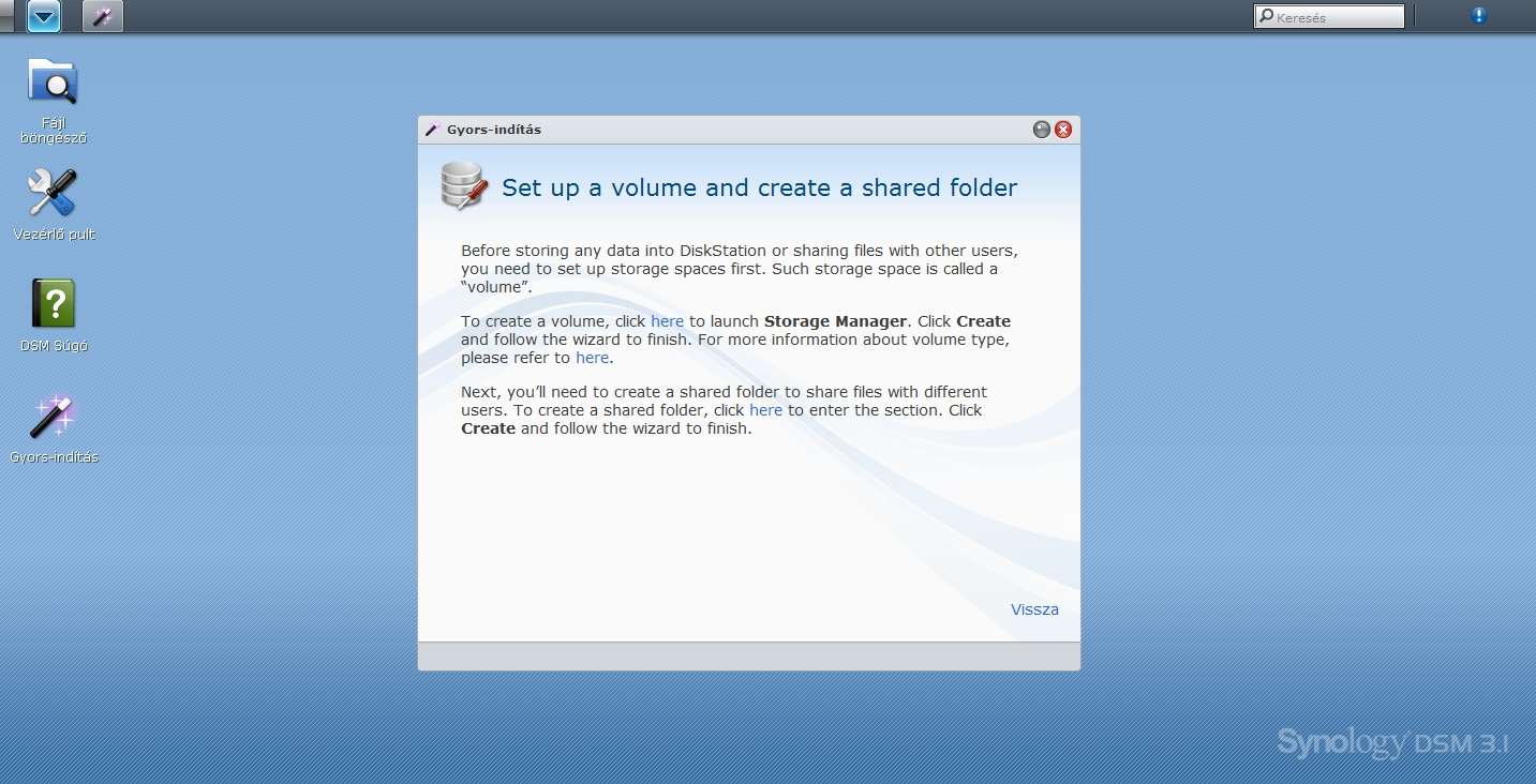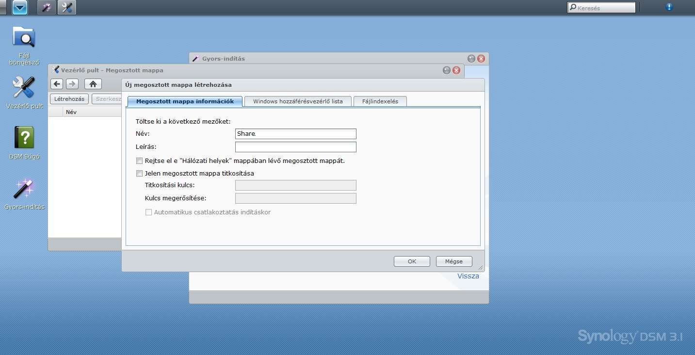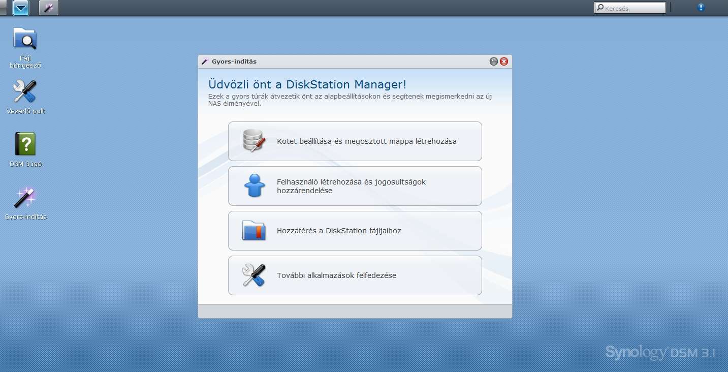 Ha készen vagyunk, a böngészőn keresztül már el is érhetjük a DS211j kezelőfelületét, amely rengeteget változott az elődhöz képest, a DSM 3.1 operációs rendszernek köszönhetően. A legfeltűnőbb különbség az ablakos megjelenítés, ami lehetővé teszi, hogy egyszerre több beállítást és szolgáltatást is elérjünk.