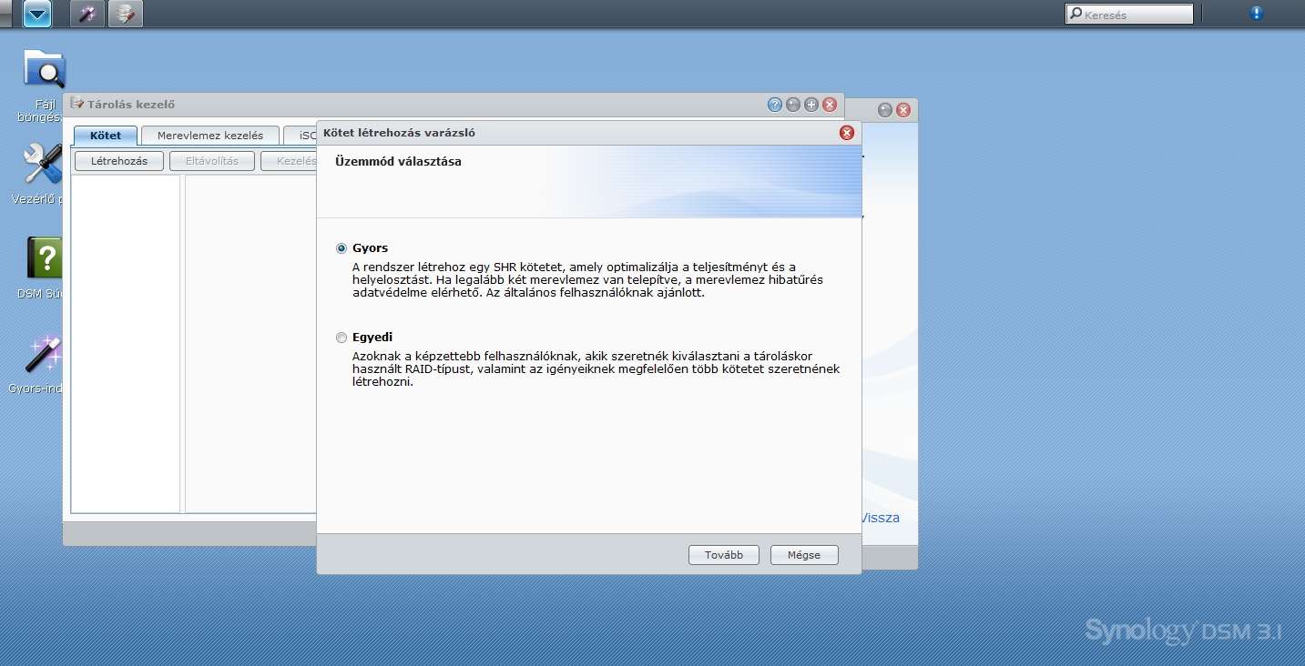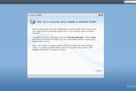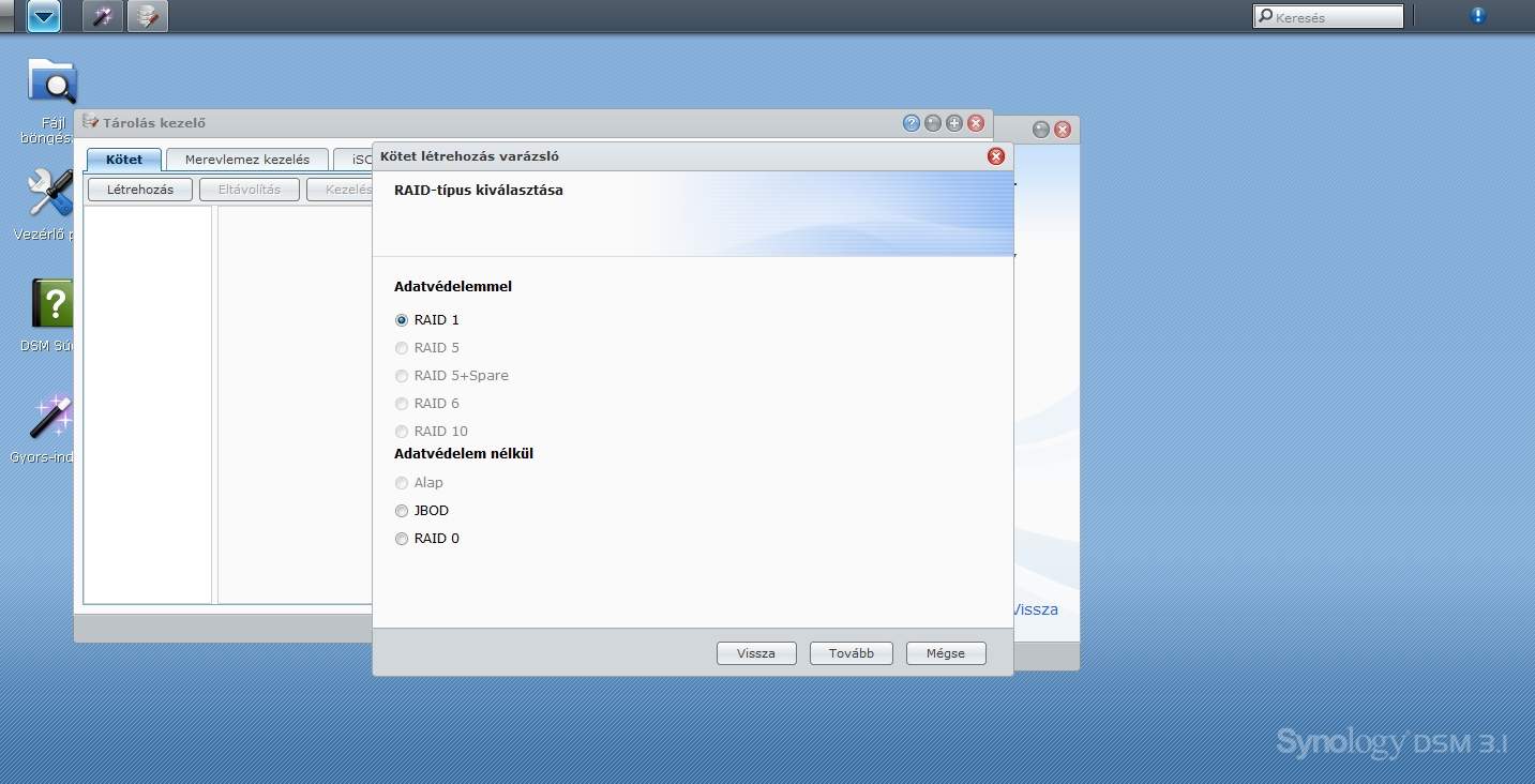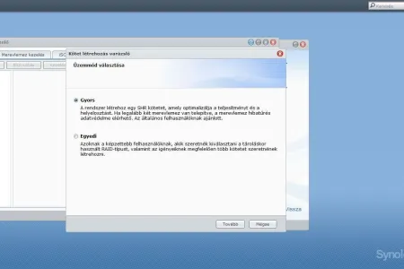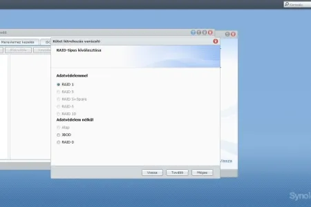 Az első bejelentkezéskor egy varázsló fogad bennünket, amellyel az alapvető feladatokat érhetjük el – elsőként egy új kötetet kell létrehoznunk. Ez lehet RAID 0, 1 illetve JBOD felépítésű is, de akár olyan kombinációt is kialakíthatunk, hogy a merevlemezek egy részén RAID 0, a maradékon pedig JBOD tömböt hozunk létre. Ha netán két különböző méretű HDD-t építettünk volna be, akkor a kisebbiknek megfelelő RAID 1 tömböt is csinálhatunk, a nagyobbik merevlemezen pedig a fennmaradó helyre egy második kötetet helyezhetünk el.