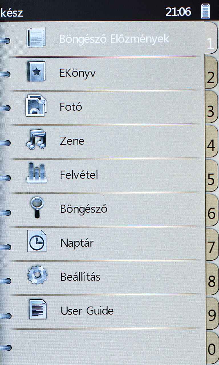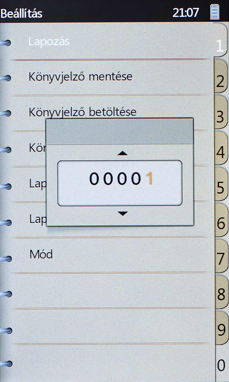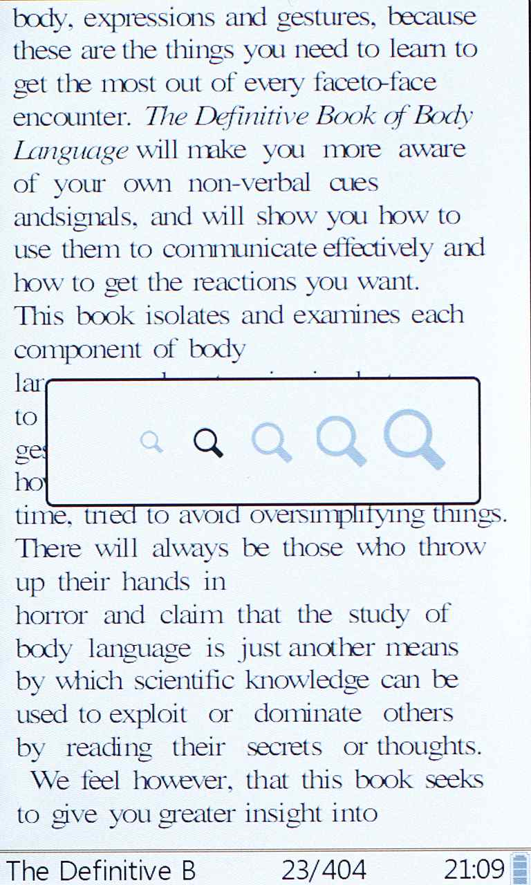Olvasás közben a szövegek nagyítására vagy kicsinyítésére a nagyító gomb szolgál. PDF-nél öt, a többi esetben három fokozatban módosíthatjuk a betűméretet, ez utóbbi meglehetősen kevés, az egyes fokozatban ugyanis túl kicsik a karakterek, a kettesben viszont már túl nagyok, csak kevés fér belőlük a képernyőre.
