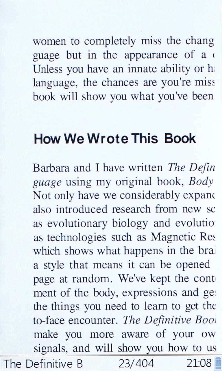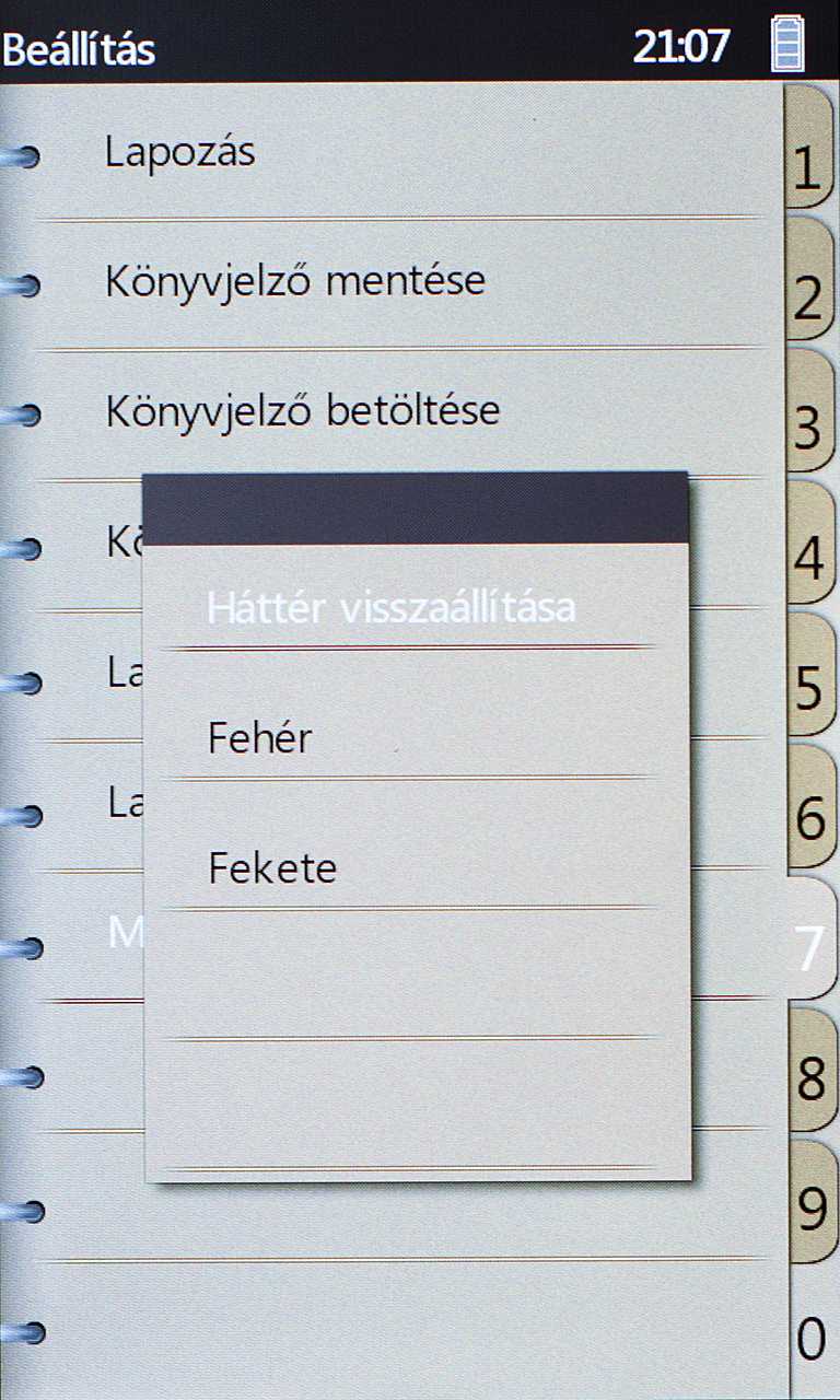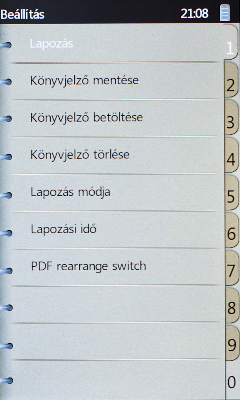 Az „m” gombot megnyomva a helyi menübe jutunk, amelynek tartalma az éppen megjelenített formátumtól függően kicsit változik. Ami közös: lehetőségünk van megadott oldalra ugrani, könyvjelzőket elhelyezni vagy törölni, valamint beállíthatunk automatikus lapozást is. A legtöbb esetben a Mód menüponttal a kinézeten is változtathatunk (fekete betűk fehér háttéren, ugyanez inverzben, vagy bézs színű háttérrel), a PDF fájloknál viszont, ehelyett, a fordításból kimaradt PDF rearrange switch menüpont segítségével, az újratördelést kapcsolhatjuk be (a többi formátumnál ez automatikus). Az újratördelés végeredménye egyébként nem mindig tökéletes, de még az olvashatóság határán mozog.