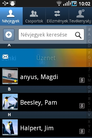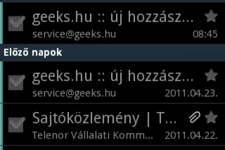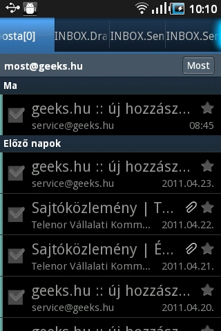 Az SMS/MMS küldés szintén jól használható, az üzenetek pedig a megszokott párbeszédes formában jelennek meg. Az SMS-ek így jól áttekinthetől, de a keresésre még mindig a rendes keresőalkalmazás a legjobb. A levelek kezelésére az Androidnál megszokott e-mail alkalmazást használhatjuk (természetesen több fiók egy nézetben is megtekinthető) és a Gmail-kliens is rendben teszi a dolgát.