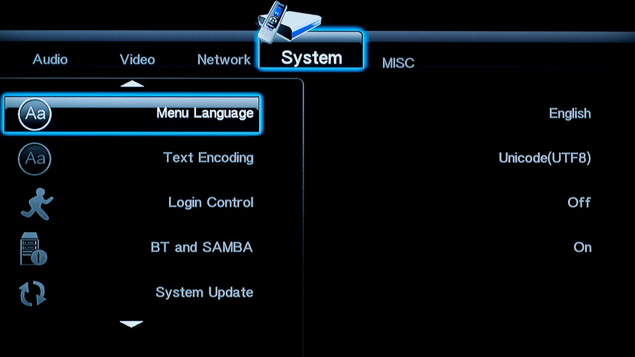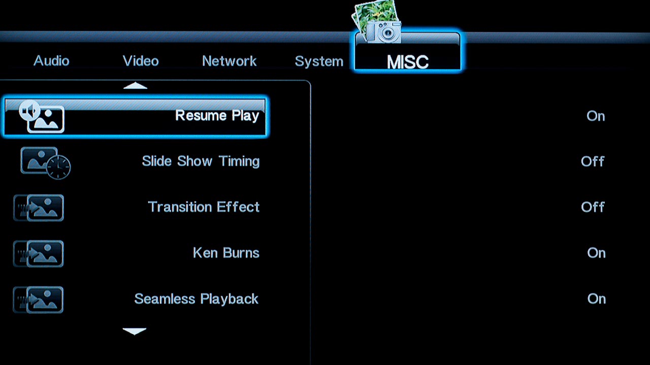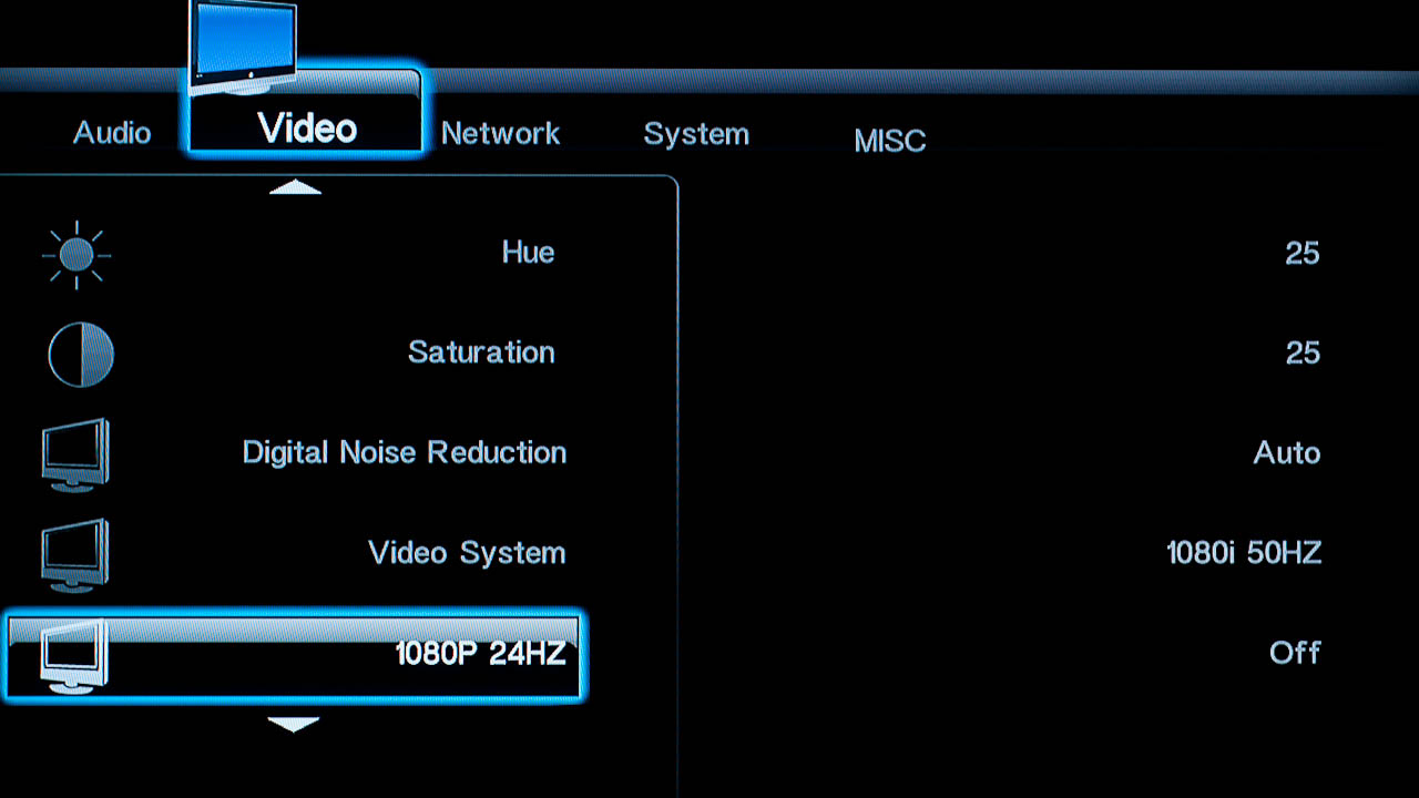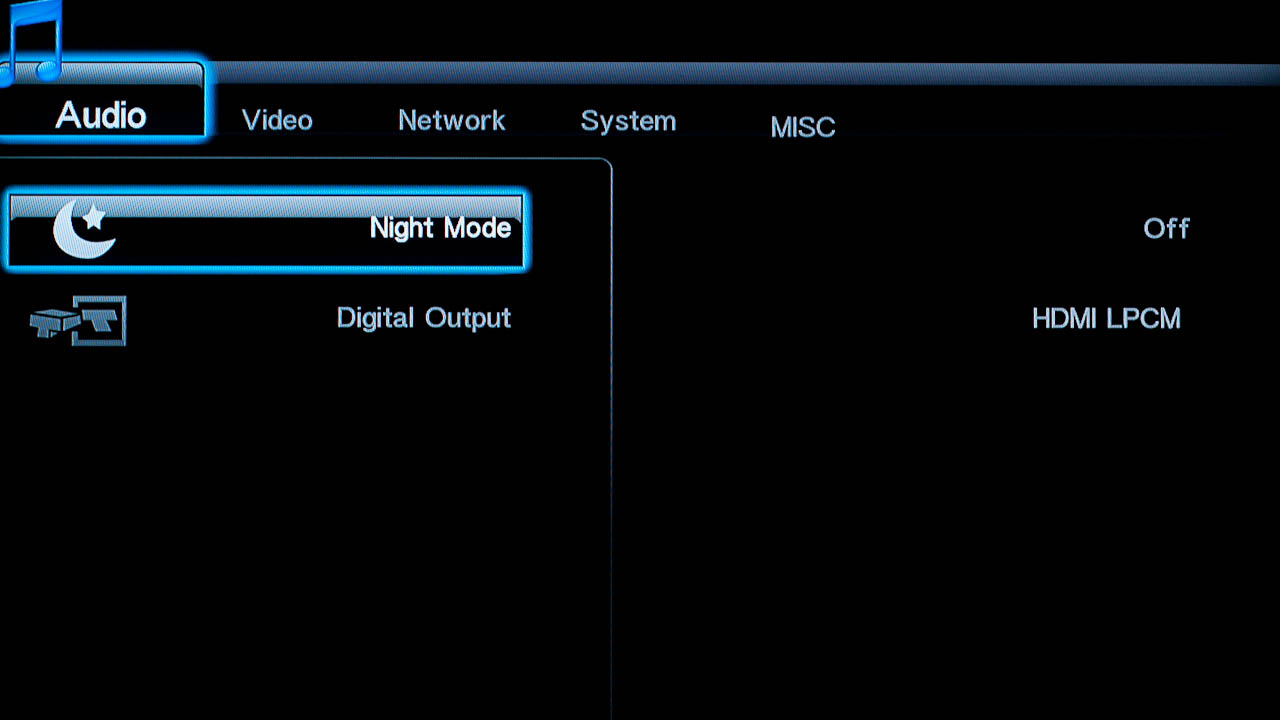 Tévéhez vagy projektorhoz csatlakoztatva a lejátszót a megszokott felbontások és frissítések állnak rendelkezésre, közöttük 1080p/24 Hz is. Különleges opciókat nem találunk a menüben, de lehet változtatni a fényerőn, a kontraszton és az árnyalaton, illetve a HDMI-be kevert hangjel típusán is. A rendszerbeállítások között lehetőségünk van ki- és bekapcsolni a tárolók hálózati megosztását, illetve a hozzáféréshez felhasználónevet és jelszót is rendelni.