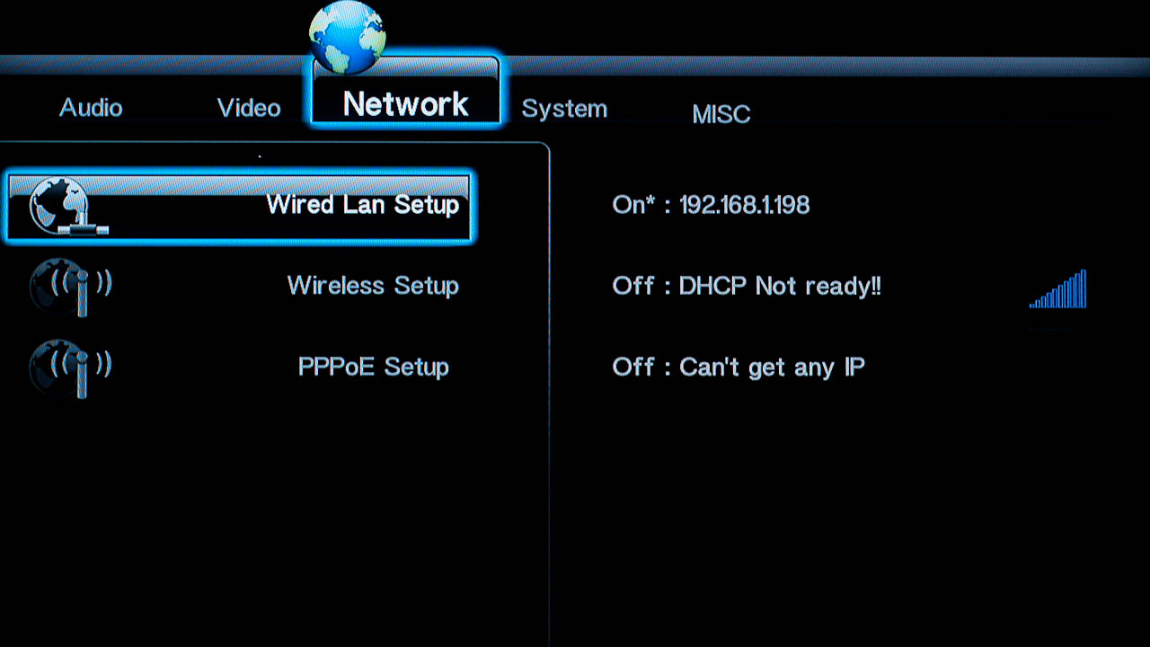 A hálózati kapcsolat felépítése egy DHCP-vel rendelkező otthoni LAN esetében nem bonyolult, a beállítások menüben (sajnos a készülék a jelenlegi firmware-rel még nem tud magyarul) csak el kell fogadnunk a felajánlott IP címet. Természetesen lehetőségünk van ezt manuálisan is megadni, illetve ha közvetlenül egy ADSL-modemre csatlakozunk a lejátszóval, akkor a PPPoE beállításokat is megadhatjuk itt.