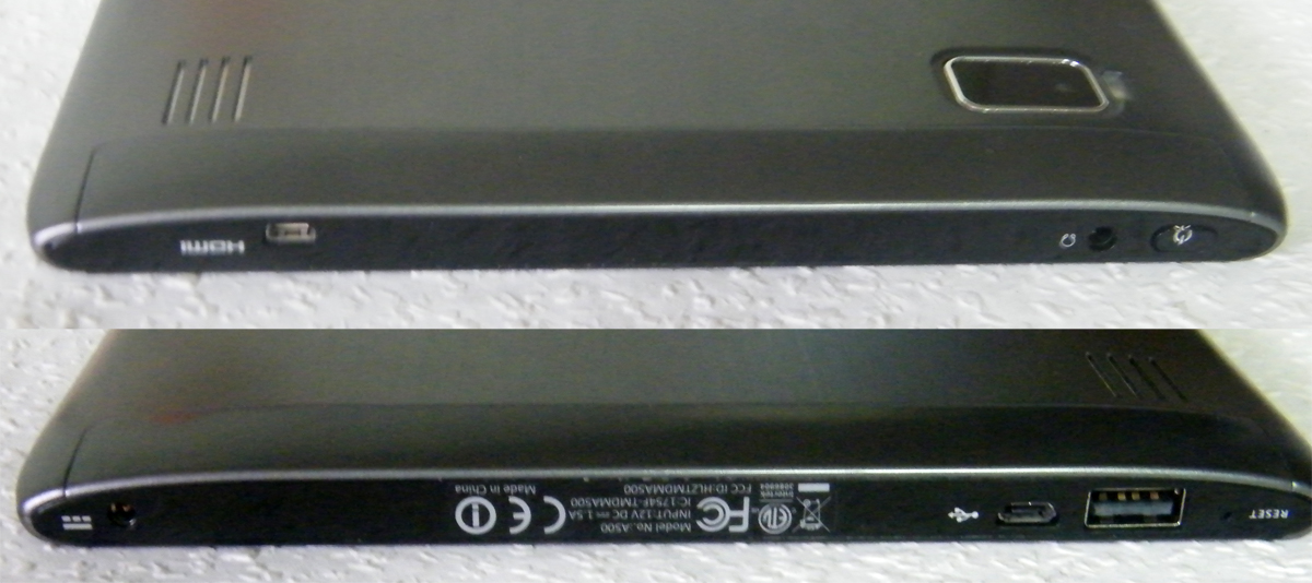 A felső oldalon balra igazítva helyezkedik el a króm hatású hangerőszabályzó gomb, mellette pedig egy kis toló kapcsoló, ami az iPad megoldására hasonlít leginkább: a funkciója az, hogy a kijelző elforgatását kapcsolja ki hardveresen. Mindezek mellett egy kis műanyag ajtó mögött rejtőzik a memóriakártya foglalata. A későbbi érkező 3G-s modellnek a SIM kártya slotja is itt fog elhelyezkedni: a nálunk járt A500-on látszik, hogy a házon megvan ennek a helye, viszont egy matricával szépen le is van ragasztva. A gép alsó részén is található még egy csatlakozó; ennek igazából funkciója csak akkor van, ha megvásároljuk az Iconai A500 mellé az amúgy borsos árú (kb. 22 ezer forint) dokkolót is, amivel a tévéhez köthetjük a tabletet és a hozzá tartozó távirányítóval multimédiás mindenessé varázsolhatjuk.