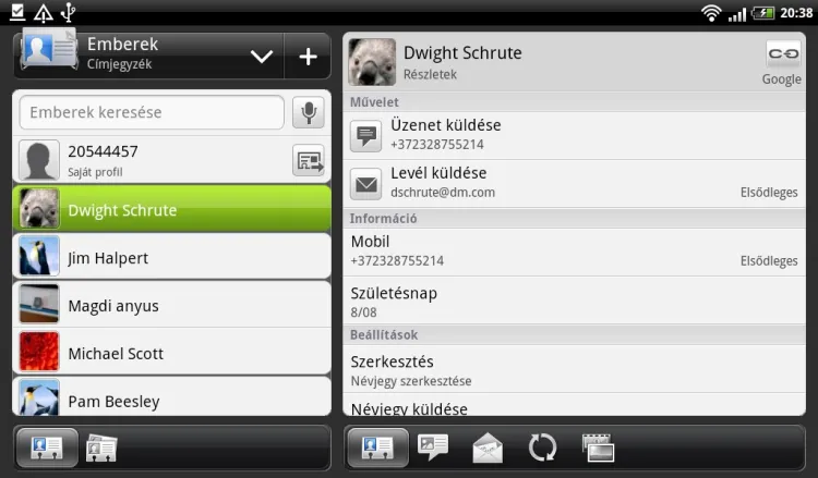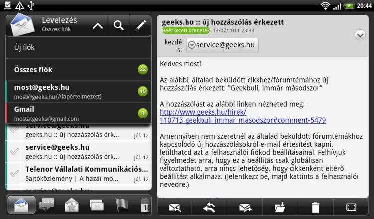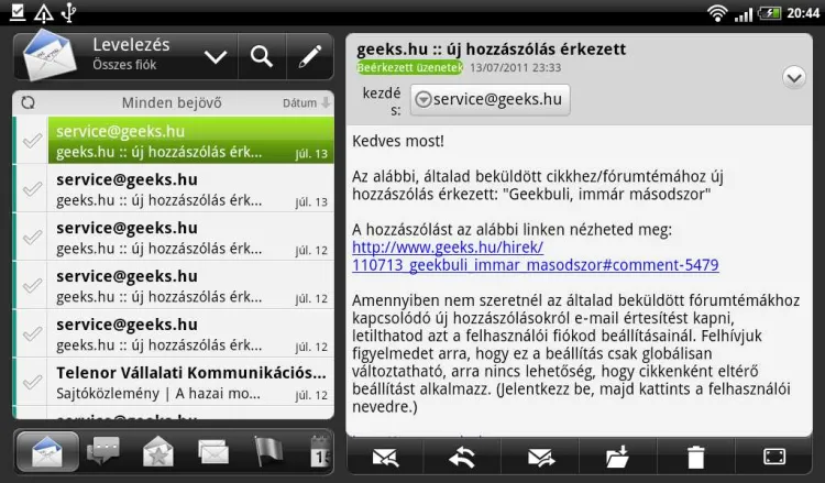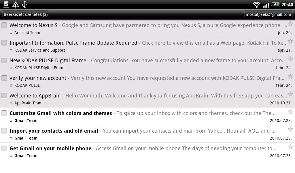Levelezőkliensből kettőt kapunk: a Gmailhez tartozó a szokásos funkciókkal rendelkezik, míg a másikkal POP3, IMAP és Exchange fiókokhoz is kapcsolódhatunk. Az Emberekhez hasonlóan fekvő helyzetben itt is kéthasábos nézetet kapunk, levéllistával és előnézeti ablakkal.
