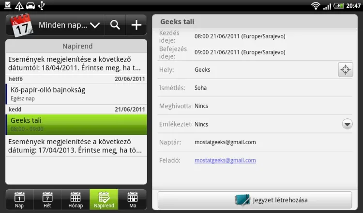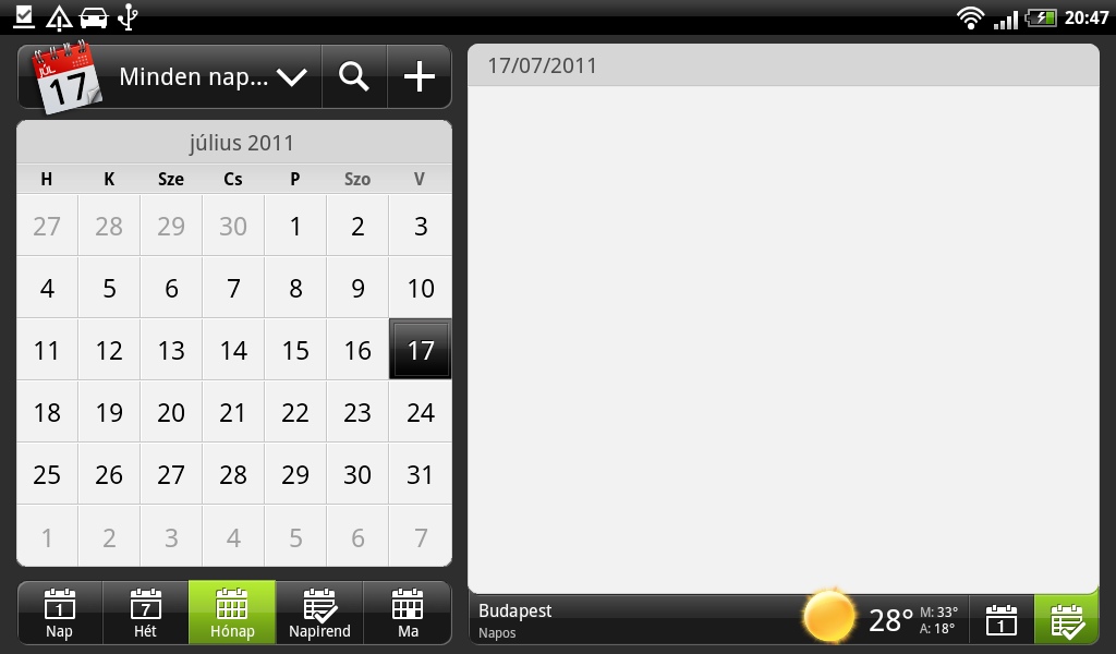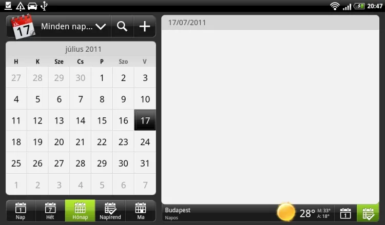 A teendők nyilvántartására szolgáló Naptár hasonlóan impozáns: álló helyzetben havi nézetben egyszerre két hónapot láthatunk, fekvő helyzetben pedig naptár- és napi nézetet kapunk egymás mellett. A nézetek között természetesen szabadon lehet váltogatni, havi, heti és napi bontás is rendelkezésre áll, illetve van egy, az összes teendő áttekintésre módot adó Napirend is. A telefon saját naptárán kívül a készüléket a Google és a Facebook naptárunkkal is szinkronizálhatjuk.