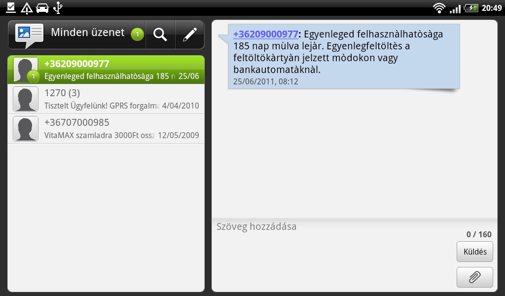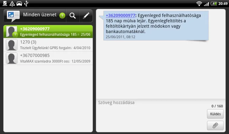 Az ehhez tartozó alkalmazásban az üzenetek a megszokott párbeszédes formában jelennek meg, a szöveg pedig beírására a HTC által kicsit megtuningolt billentyűzet használható, amellyel a magyar nyelvű prediktív szövegbevitel is működik.