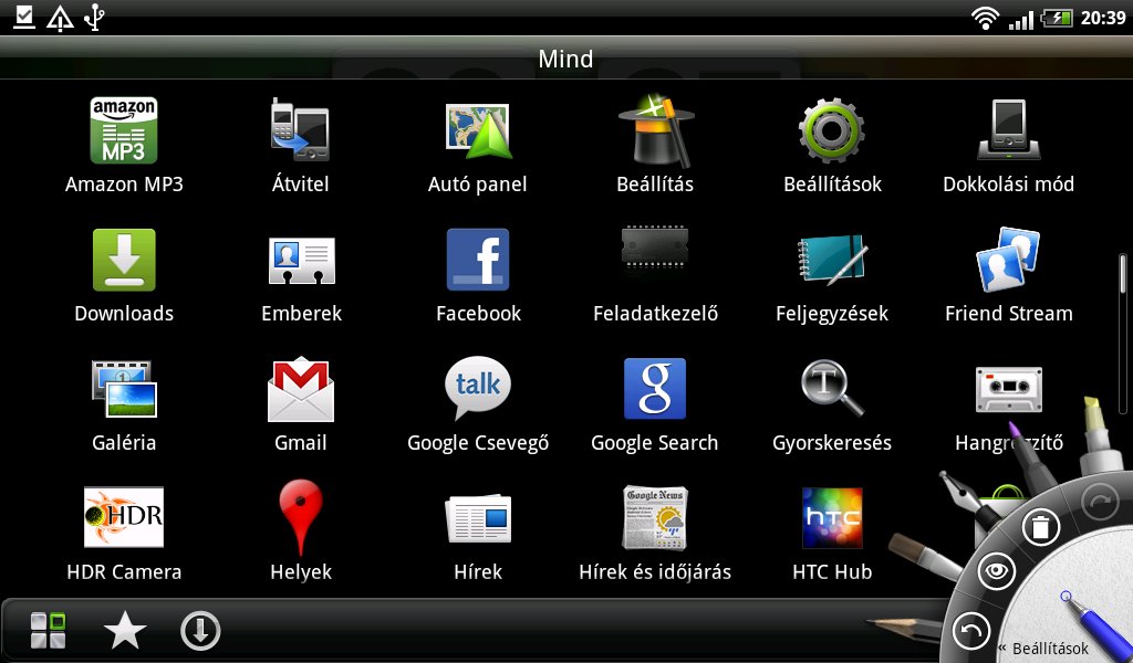 A végére hagytuk a tollat és a hozzá tartozó alkalmazást, a Scribe-ot. Bár a HTC nagy jelentőséget tulajdonít neki, és bemutatásakor is sokat foglalkozott vele, szerintünk nem igazán nagy durranás. Aktiválásához hozzá kell érintenünk a tollat a képernyőhöz, ekkor a készülék gyakorlatilag lefotózza nekünk az adott látványt, és erre tudunk aztán rajzolni vagy jegyzetelni. Ez szinte minden képernyőn működik, kivéve a filmeket és az időjárást.