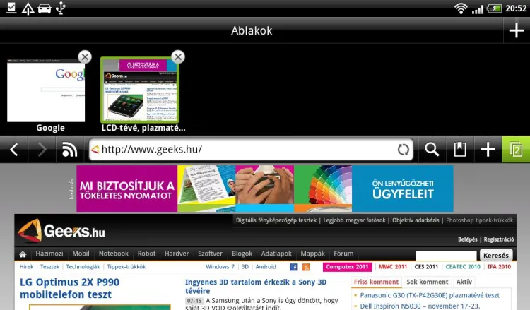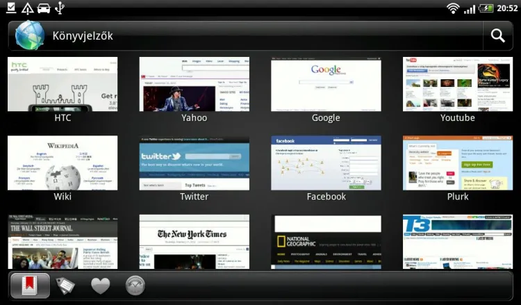 A mobilokkal ellentétben itt felül mindig látszik a címsor, amelynek két szélén plusz gombokat találunk. Ezek közül a bal oldalival az RSS feedeket adhatjuk az olvasóhoz, míg a jobb oldalon a keresőt, a könyvjelzőket és a többablakos böngésző gombjait helyezték el a HTC programozói.