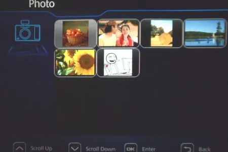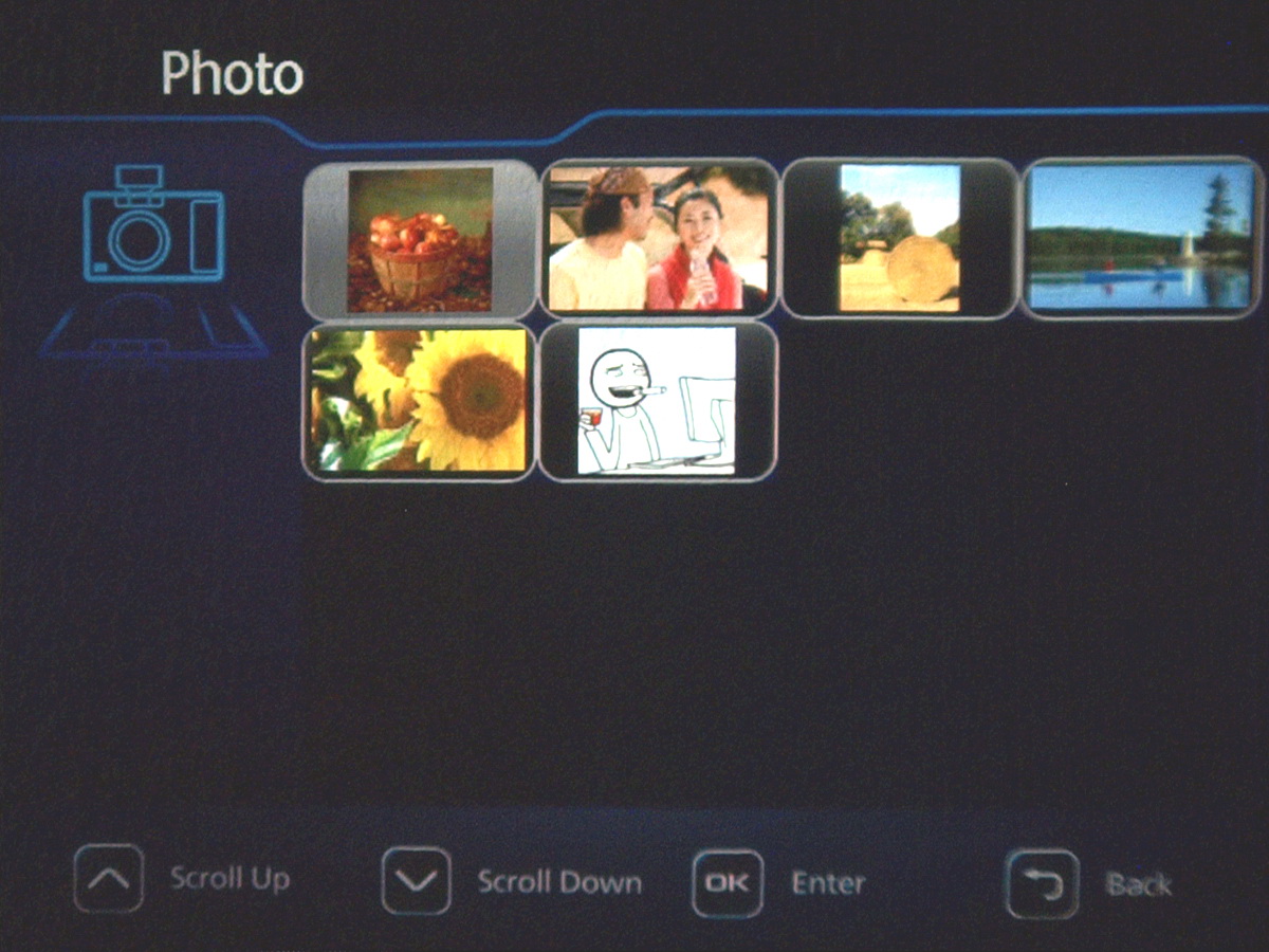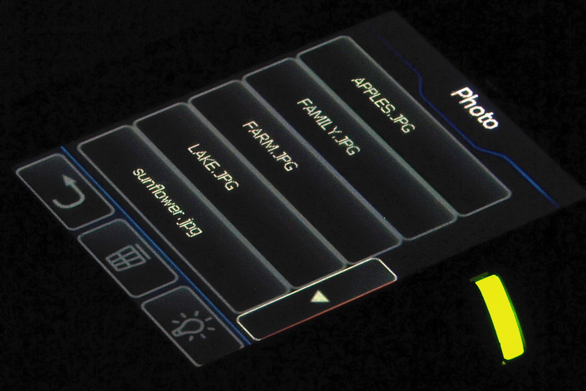 Bármelyik lehetőséget is válasszuk, alapesetben az LCD-n látjuk a dokumentumokat, amelyek közül név alapján választhatunk. A kijelző alsó részén – szintén minden esetben – három gombot kapunk, amelyek közül az első a visszalépésre szolgál, a másodikkal a nézetet változtathatjuk meg, a harmadikkal pedig bekapcsolhatjuk a vetítést. Ez utóbbi esetben egy sokkal használhatóbb felületen válogathatunk, a képek esetében például rögtön lesz előnézeti kép is. Az LCD-n nemcsak ebben az esetben jelennek meg gombok a navigációhoz, hanem akkor is, ha elindítjuk a filmnézést, diavetítést, dokumentumnézegetést stb.