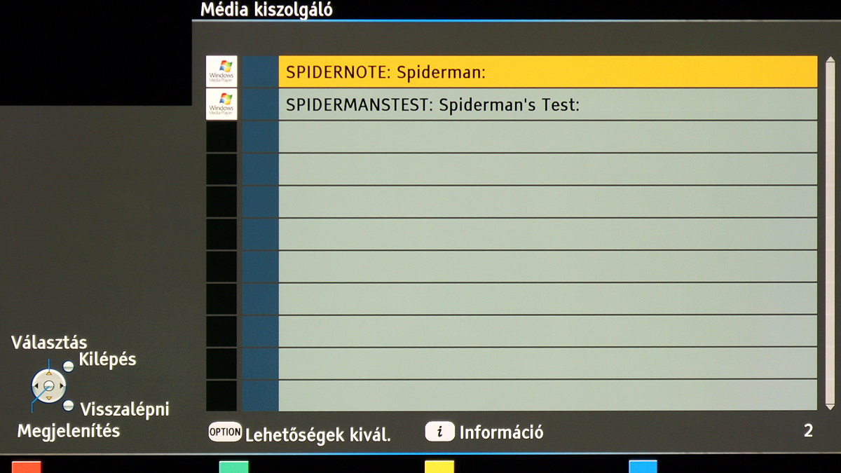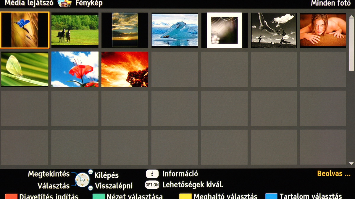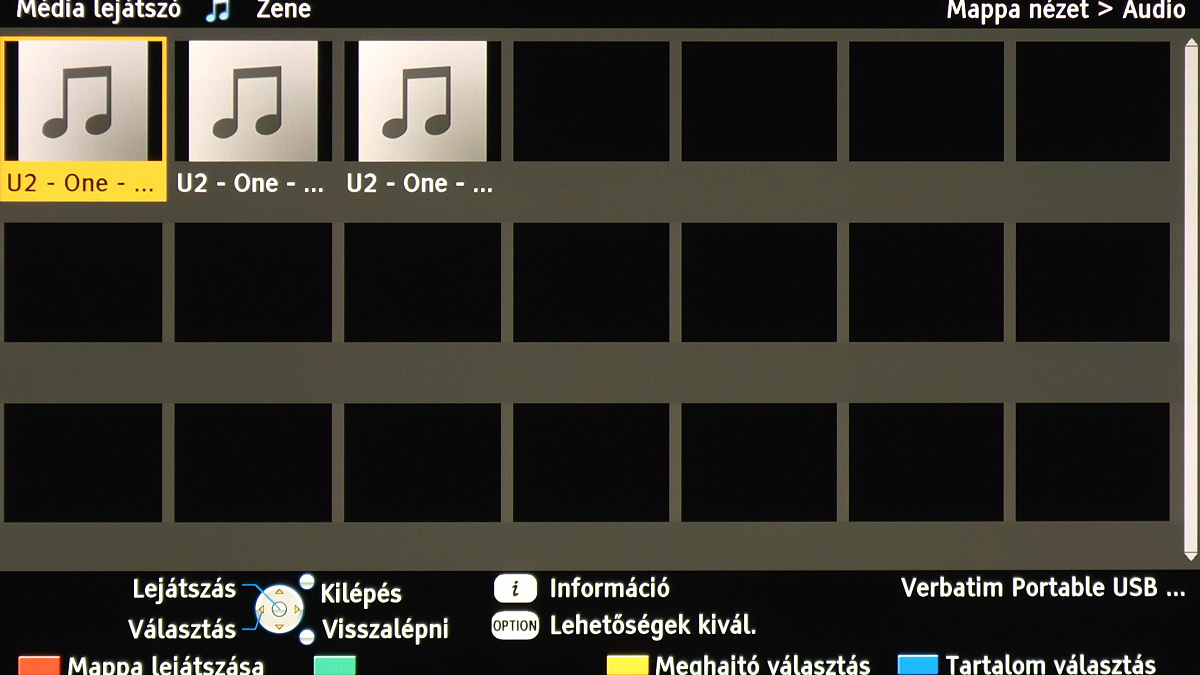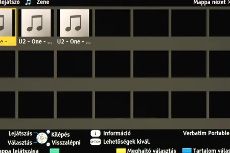 A tévé egyszerre csak videókat, csak képeket vagy csak zenéket tud megjeleníteni, de a váltáshoz nem kell kilépni; ehelyett a távirányító kék gombjával lépkedhetünk a fájltípusok között.