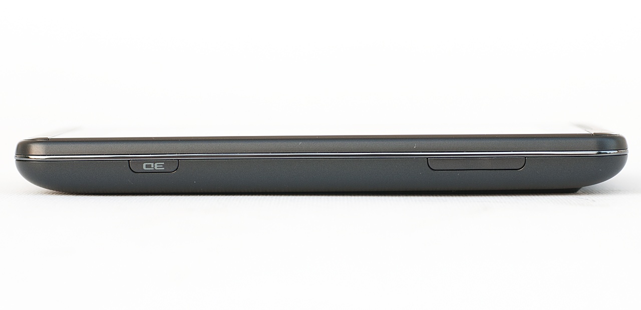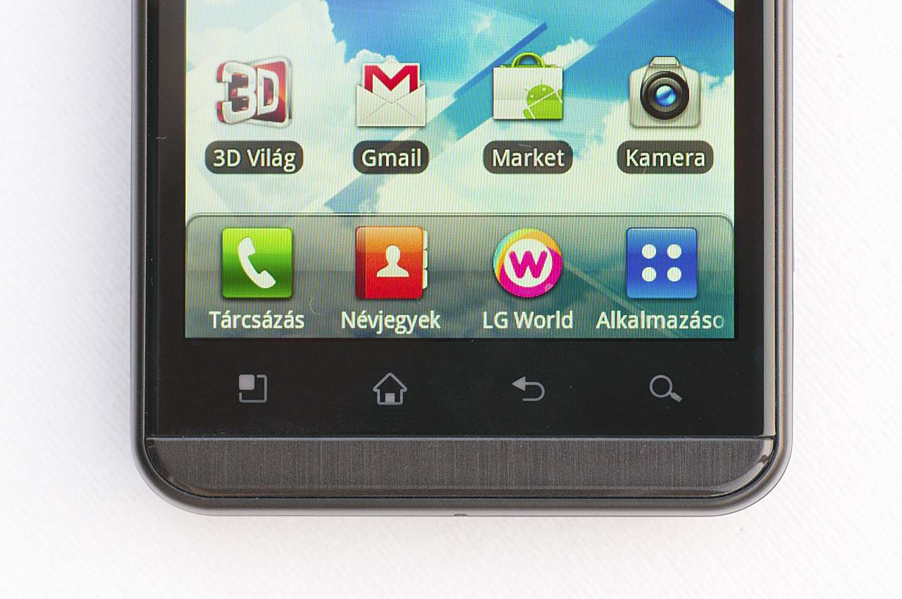 A kijelző feletti perem közepén a márkajelzés, ettől jobbra a VGA felbontású előlapi kamera található. A kettő között halványan felfedezhetők a szokásos érzékelők, a hangszóró rácsa pedig ezek felett, középen található. További gombok kerültek a jobb oldalra és a felső élre – az előbbiek közül a felső pár a hangerő állítására szolgál, míg az alsó a 3D-s interfészt indítja el. Számunkra egy cseppet zavaró volt, hogy ez pontosan ott van, ahol a kamera expozíciós gombját keresnénk.