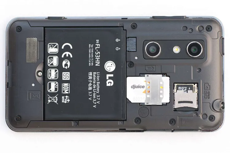 A telefont megfordítva láthatjuk a 3D-s „lét” másik fontos elemét, a dupla kameramodult. A két, egyenként 5 Mpixeles egység között egy LED-es segédfény bújik meg. Ha leszedjük a műanyag hátlapot, az 1500 mAh-ás akku mellett a SIM kártya foglalatát és a microSD kártya helyét találjuk, ez utóbb az akku eltávolítása nélkül is cserélhető.