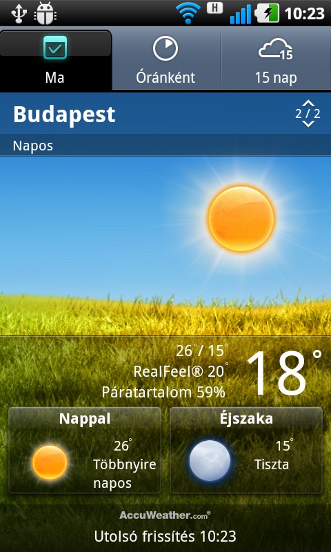 Mivel az androidos készülékeknél gyakorlatilag kötelező a látványos időjárásjelző alkalmazás (köszönhetően a HTC-nek), az LG sem hagyhatta ki a megfelelő szoftvert a kínálatból. Ez egyébként az AccuWeathertől származik és akár óránkénti vagy öt napra előre szóló információkat is tud nyújtani.