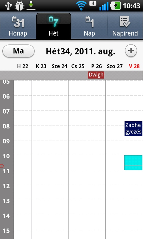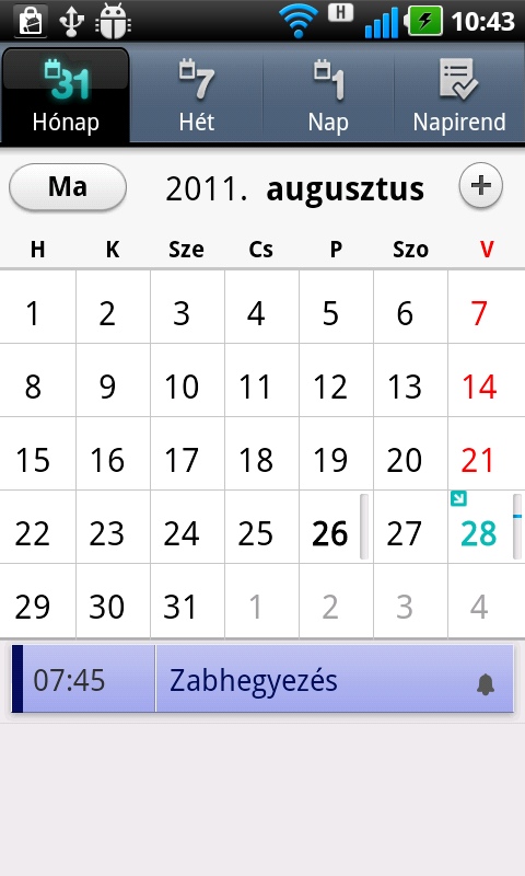 A teendők nyilvántartására a telefon remekül megfelel. Az Android naptár része nagyon jól sikerült, a menü segítségével villámgyorsan válthatunk a havi, heti és napi bontás között, illetve egy áttekintő, csak az események listáját mutató nézet is rendelkezésre áll, amelyet a felső, jobb oldali gombbal érhetünk el.