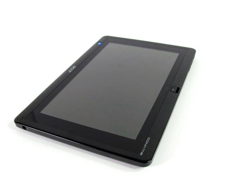 A készülék előlapját, ahogy ez az összes tablet esetén lenni szokott, a kijelző tölti be. A W501 esetében a standard, 10,1"-os méretet választotta az Acer. A kijelző védelmét ez esetben is a Corning által gyártott Gorilla Glass edzett üveglap szolgálja, amely ellenáll a karcolásoknak is. A kijelző köré kifejezetten vastag keret került, ami nem mutat valami szépen – talán nem is találkoztunk még ekkora szélességgel ilyen készülékek esetében. A keret közepén felül helyezkedik el egy 1,3 Mpixeles webkamera, felette pedig egy mélyedés, amelyre akkor van szükségünk, ha a készüléket a dokkolójával használjuk és összecsuknánk. Ezektől balra a beépített mikrofon nyílása található. Alul a bal oldalon találunk egy windowsos gombot, ez a billentyűzeten megszokott Start gombnak felel meg. Figyelembe véve, hogy felette a betöltött operációs rendszerben is ott figyel az eredeti gomb, nem feltétlenül lenne rá szükség, még akkor sem, ha tud kéken és pirosan is világítani. A két alsó sarokban egy-egy kis kört találunk, amelyek mögött mágnes van; ebből könnyen kitalálható, hogy ezek felelnek azért, hogy a tablet és a billentyűzet összecsukott állapotban ne váljanak szét.
