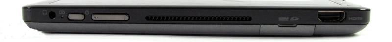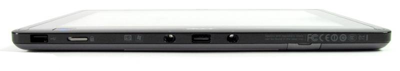 A tablet jobb oldalán, felül egy 3,5 mm-es audio csatlakozó található, közvetlenül mellette pedig egy akkumulátorhoz tartozó LED, ami pirosan villog, amikor már csatlakoztatnunk kellene a töltőt. Tovább haladva ezüstszínű gombok következnek, egy bekapcsoló gomb, illetve egy két tagból álló hangerőszabályzó. Középen hosszan elnyúlik a vékony szellőzőnyílás, amely sajnos szinte kötelező egy x86-os processzorral szerelt készülékre. A tablet alján teljes méretű HDMI csatlakozó található, mellette pedig egy kis ajtó mögött a memóriakártya-olvasó helyezkedik el. A W501 bal oldalán mindösszesen csak a hálózati töltő csatlakozója található. A készülék vastagsága nem győzött meg minket, korábban más gyártók készítettek már vékonyabb windowsos táblagépet is, de az iPad 2, valamint a Galaxy Tab 10.1 vékony dizájnja mellett tűnik igazán vaskosnak a W501.