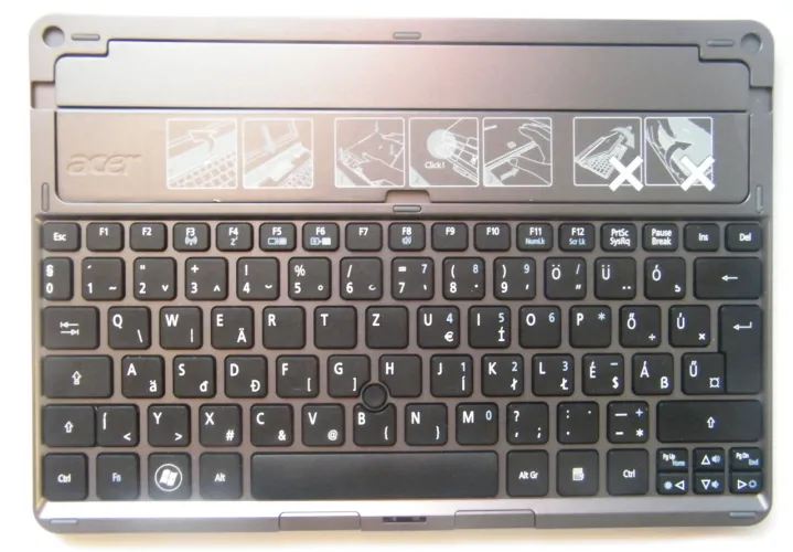 A gombok felett található kettő csapó ajtó is, amelyek közül a nagyobbikat szükséges kézzel felnyitnunk, ha a tabletet dokkolni szeretnénk. A középre helyezett USB port a dokkoló csatlakozójaként adatátvitelre szolgál. Az Acer W501-et dokkolva netbookként használhatjuk, viszont a konstrukció egyáltalán nem számít masszívnak. A függőlegeshez közel álló tablet elég nagy holtjátékkal lebeg, felemelve pedig akár le is válhat a billentyűzetről. Ha össze akarjuk csukni, akkor azt nem tehetjük meg azzal, hogy egyszerűen lehajtuk a képernyőt, mint egy netbook esetében. A tabletet előbb ki kell vennünk, lecsuknunk a reteszt, majd így ráhelyeznünk a tabletet. A táblagép alján a két mágnes tartja egyben a kijelzőt és a dokkolót, míg felül a két egérgomb közötti retesszel rögzíthetjük őket egymáshoz.